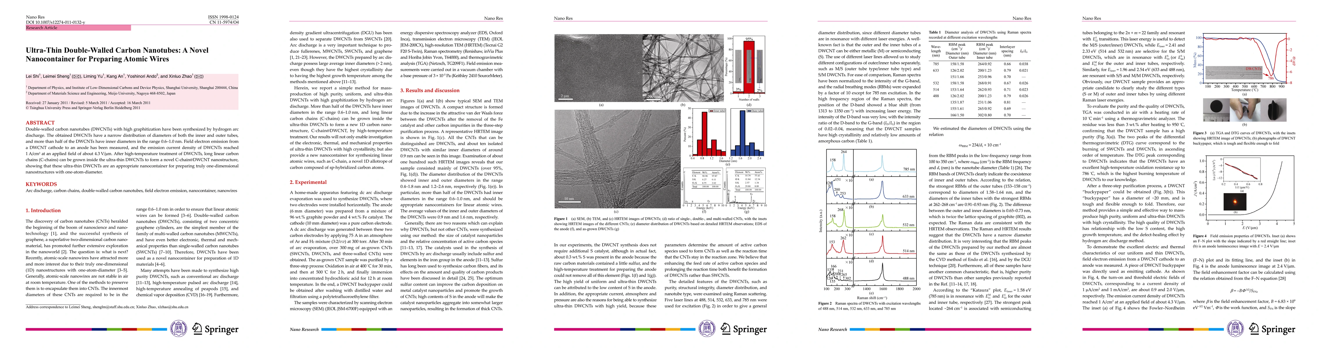 This paper synthesizes ultra-thin double-walled carbon nanotubes (DWCNTs) with precise inner diameters, demonstrating high field electron emission. It further shows that these DWCNTs can encapsulate linear carbon chains to form C-chain@DWCNT nanostructures, proving their potential as a nanocontainer for atomic wires.