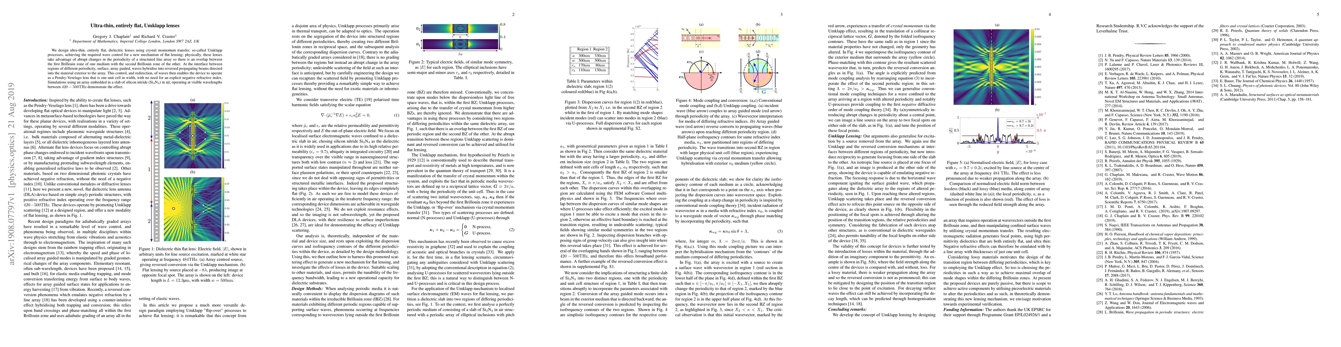 We design ultra-thin, entirely flat, dielectric lenses using crystal momentum transfer, so-called Umklapp processes, achieving the required wave control for a new mechanism of flat lensing; physically, these lenses take advantage of abrupt changes in the periodicity of a structured line array so there is an overlap between the first Brillouin zone of one medium with the second Brillouin zone of the other. At the interface between regions of different periodicity, surface, array guided, waves hybridise into reversed propagating beams directed into the material exterior to the array. This control, and redirection, of waves then enables the device to operate as a Pendry-Veselago lens that is one unit cell in width, with no need for an explicit negative refractive index. Simulations using an array embedded in a slab of silicon nitride ($\text{Si}_3\text{N}_4$) in air, operating at visible wavelengths between $420 - 500\text{THz}$ demonstrate the effect.