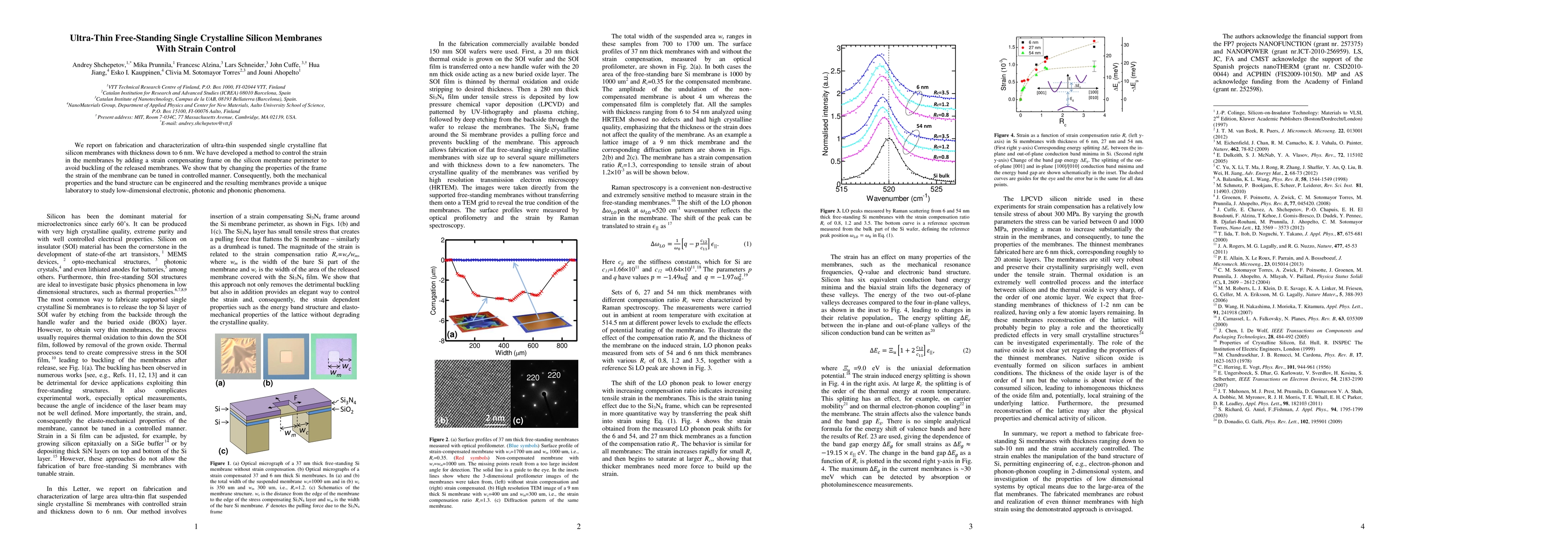 This paper details the fabrication of ultra-thin, suspended single-crystalline silicon membranes with strain control, achieving thicknesses down to 6 nm. The authors developed a strain compensating frame to prevent buckling and enable precise tuning of membrane strain, allowing for engineered mechanical and electronic properties.