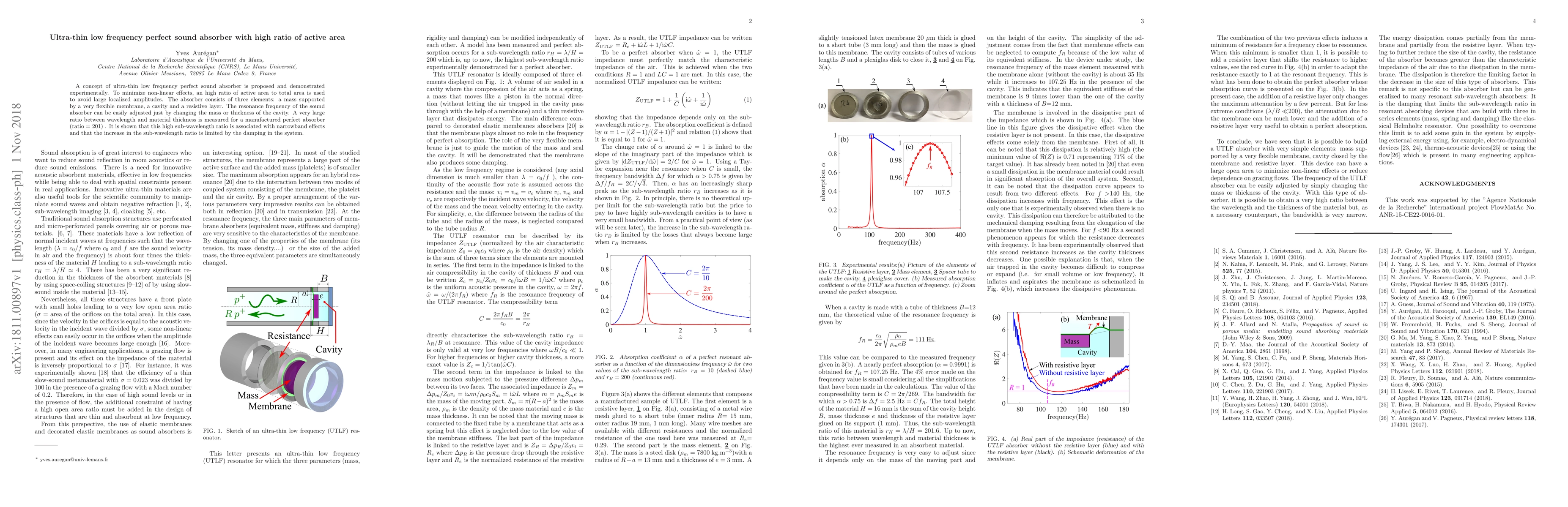 A thin, low-frequency sound absorber with a high ratio of active area to total area is proposed, featuring adjustable resonance frequency through mass or cavity thickness changes.