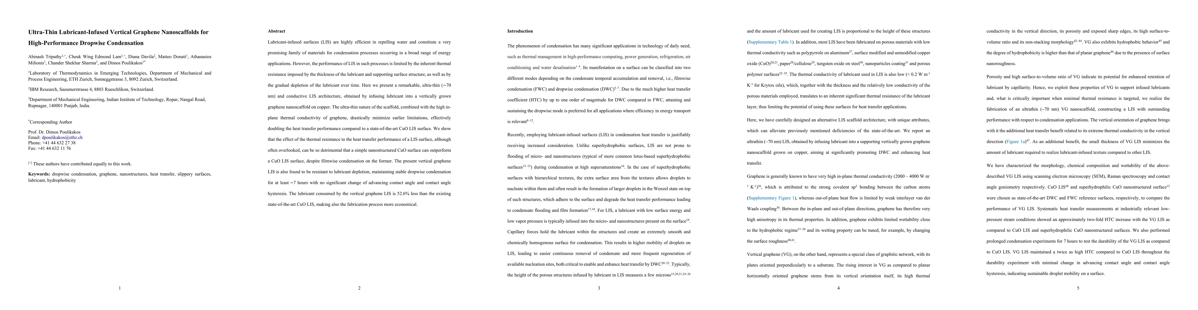 This paper introduces ultra-thin lubricant-infused vertical graphene nanoscaffolds that significantly enhance dropwise condensation performance by minimizing thermal resistance and reducing lubricant depletion. The new architecture doubles heat transfer efficiency compared to traditional CuO lubricant-infused surfaces.