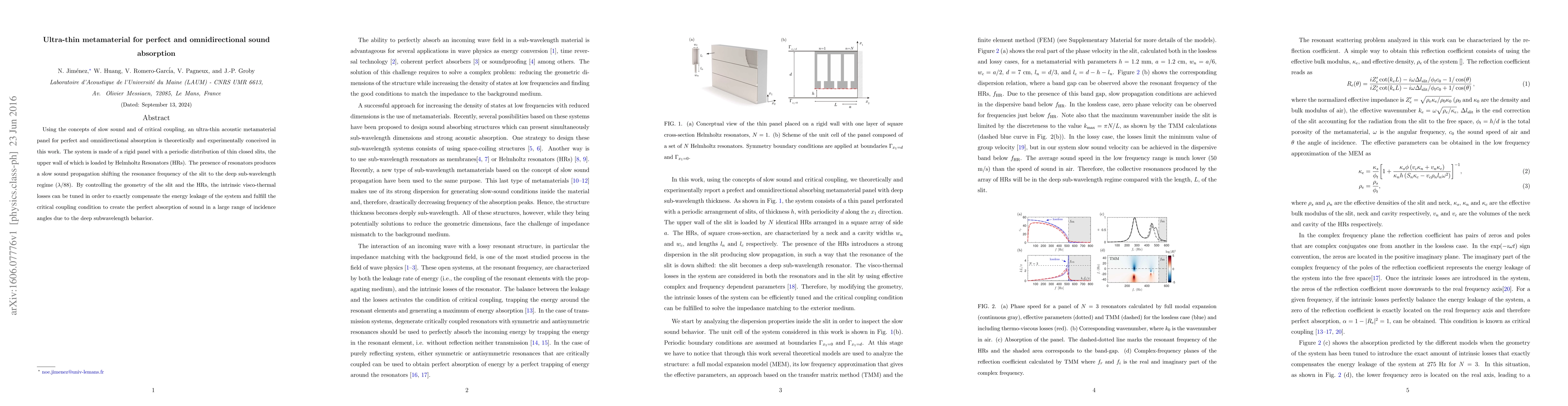 This paper proposes an ultra-thin acoustic metamaterial panel utilizing slow sound and critical coupling for perfect and omnidirectional sound absorption. The design features a rigid panel with periodic slits and Helmholtz resonators, achieving deep subwavelength resonance and optimal visco-thermal losses for broad-angle sound absorption.
