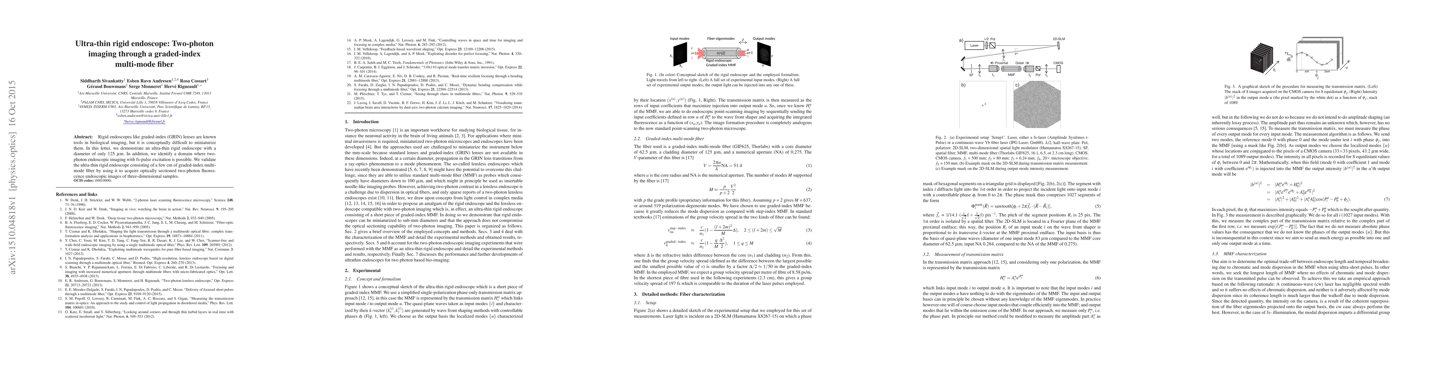 Rigid endoscopes like graded-index (GRIN) lenses are known tools in biological imaging, but it is conceptually difficult to miniaturize them. In this letter, we demonstrate an ultra-thin rigid endoscope with a diameter of only 125 microns. In addition, we identify a domain where two-photon endoscopic imaging with fs-pulse excitation is possible. We validate the ultra-thin rigid endoscope consisting of a few cm of graded-index multi-mode fiber by using it to acquire optically sectioned two-photon fluorescence endoscopic images of three-dimensional samples.
