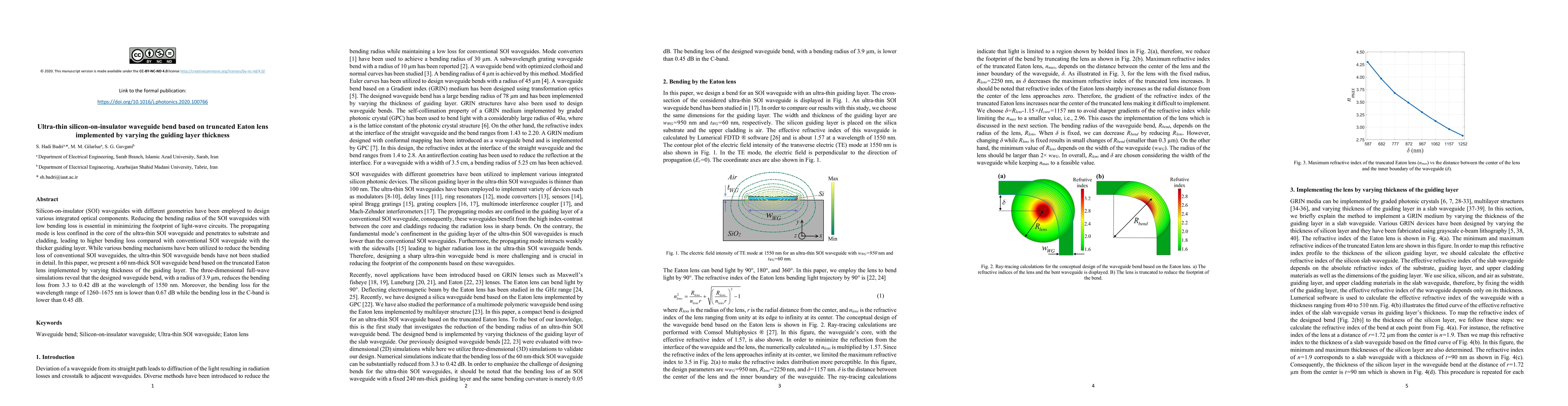 This paper presents an ultra-thin silicon-on-insulator waveguide bend based on a truncated Eaton lens, implemented by varying the guiding layer thickness, which reduces bending loss from 3.3 to 0.42 dB at 1550 nm, with losses below 0.67 dB across a broad wavelength range.