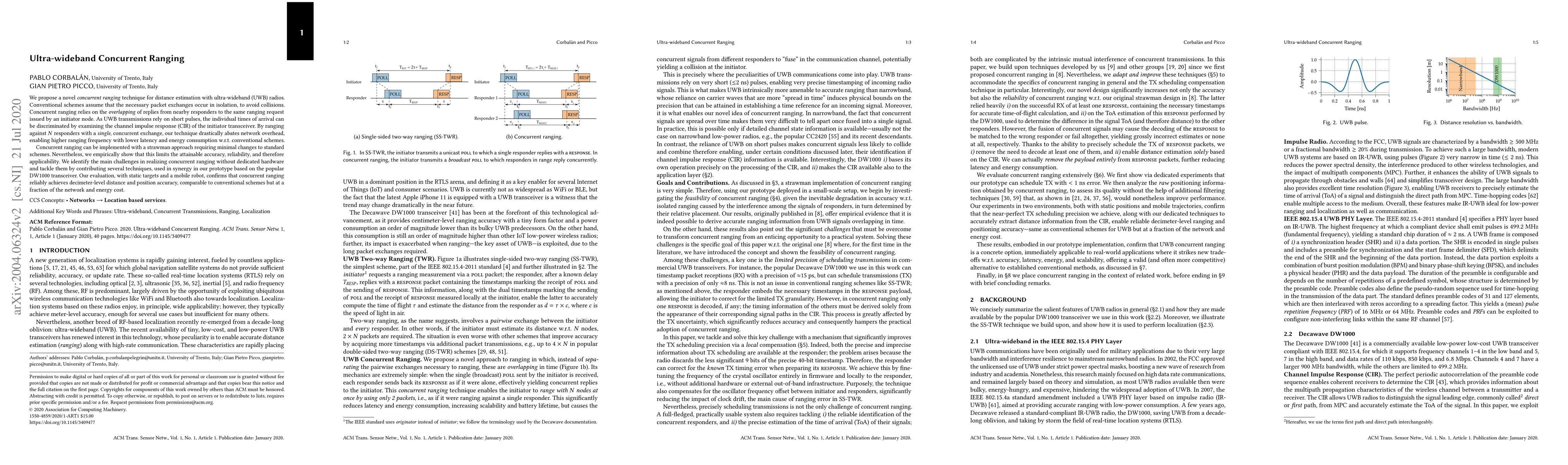 This paper proposes a novel concurrent ranging technique for ultra-wideband (UWB) radios that leverages overlapping replies from nearby responders to reduce network overhead and improve energy efficiency. The authors address challenges in achieving high accuracy without dedicated hardware and demonstrate decimeter-level distance accuracy with significantly lower network and energy costs compared to conventional schemes.