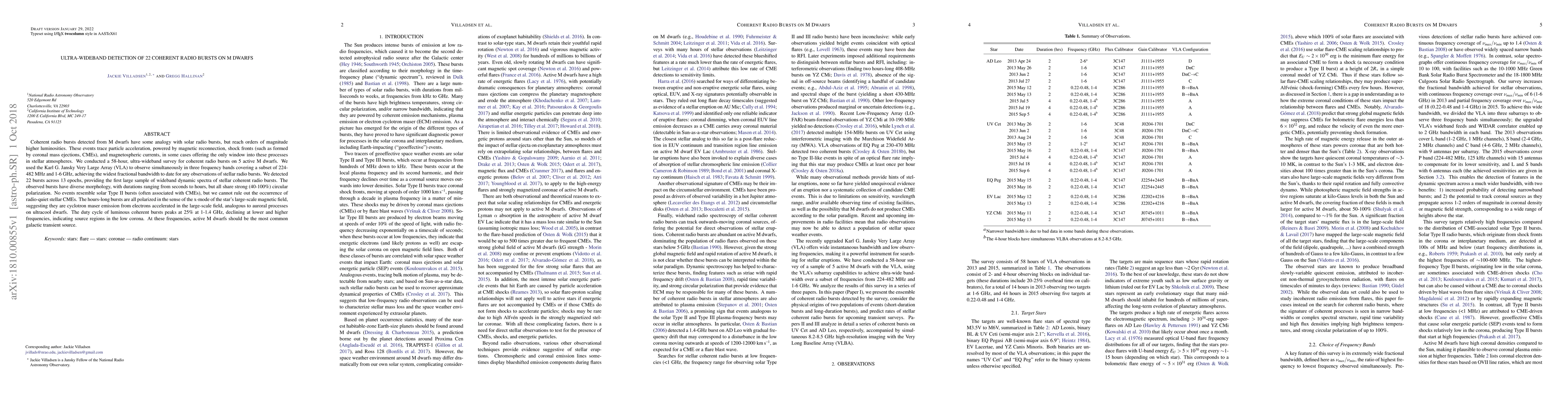 This paper reports the detection of 22 coherent radio bursts from 5 active M dwarfs using an ultra-wideband survey with the VLA, revealing diverse burst morphologies and strong circular polarization. The findings suggest these bursts are likely cyclotron maser emissions from electron acceleration in the stars' magnetic fields.