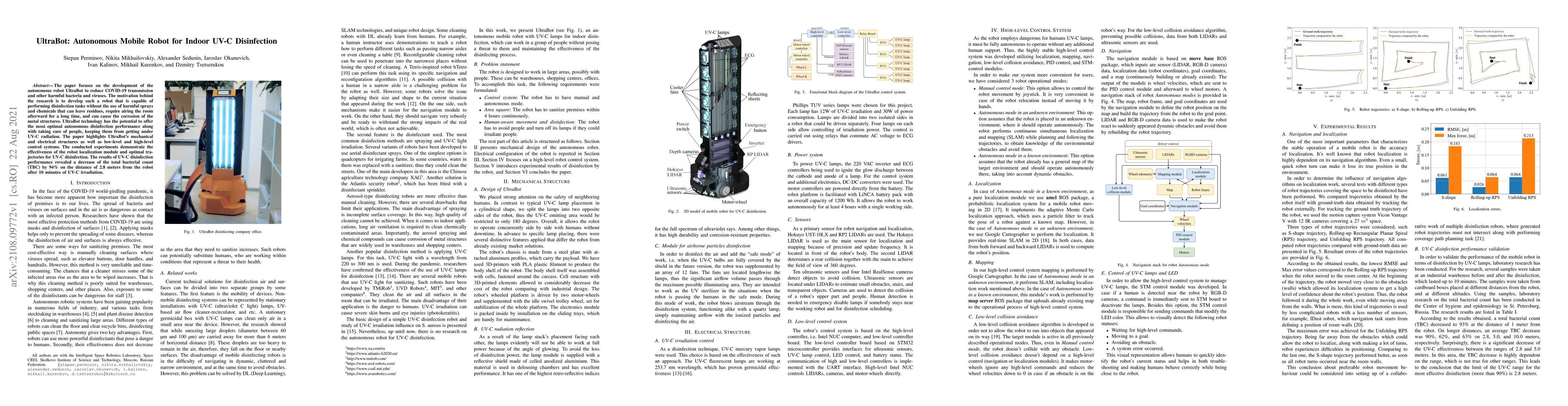 The research introduces UltraBot, an autonomous robot designed for indoor UV-C disinfection, reducing COVID-19 transmission and harmful bacteria/viruses. Experiments show UltraBot decreases total bacterial count by 94% at 2.8 meters in 10 minutes, demonstrating effective localization and optimal disinfection trajectories.