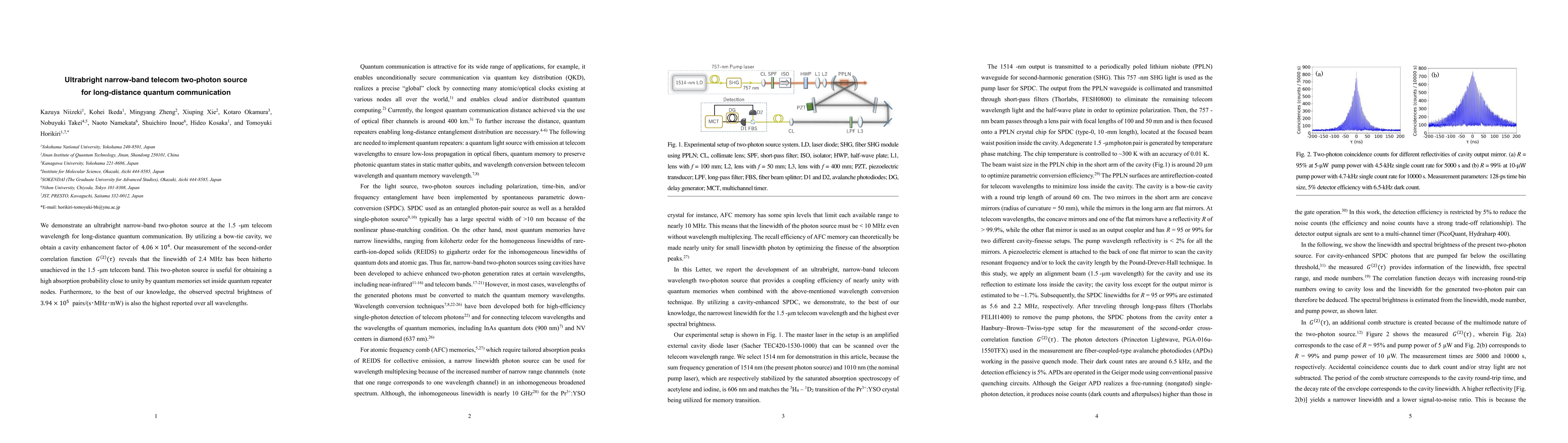 Researchers have created an ultrabright two-photon source at 1.5-micron wavelength for long-distance quantum communication, achieving a record spectral brightness of $3.94 imes 10^5$ pairs/(s$ imes$mW) and a narrow linewidth of 2.4 MHz.