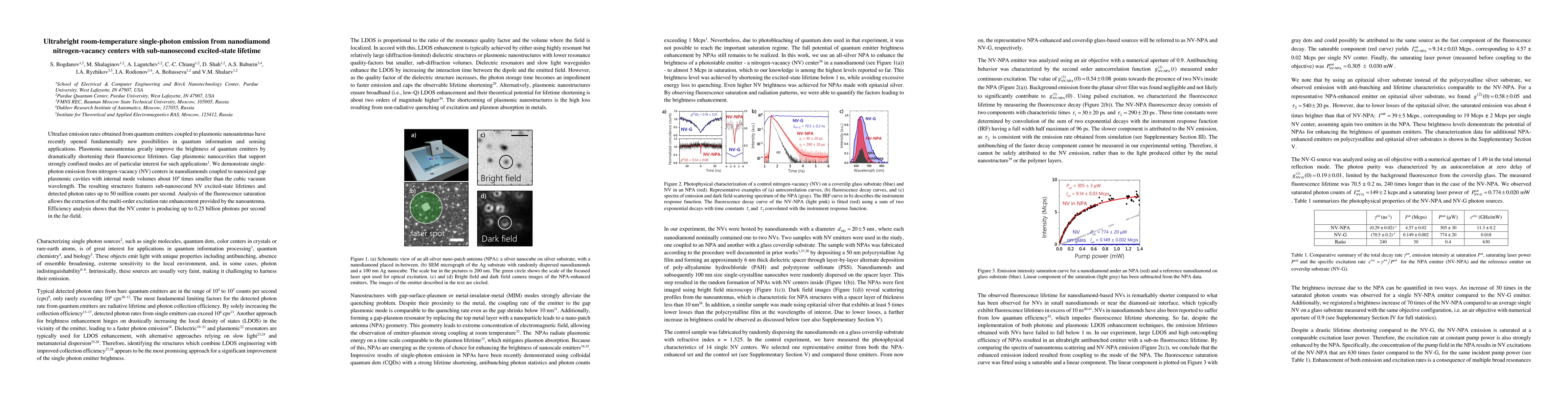 This paper demonstrates ultrabright single-photon emission from nanodiamond nitrogen-vacancy centers coupled to plasmonic nanoantennas, achieving sub-nanosecond excited-state lifetimes and photon rates up to 50 million counts per second, with the NV center producing up to 0.25 billion photons per second in the far-field.