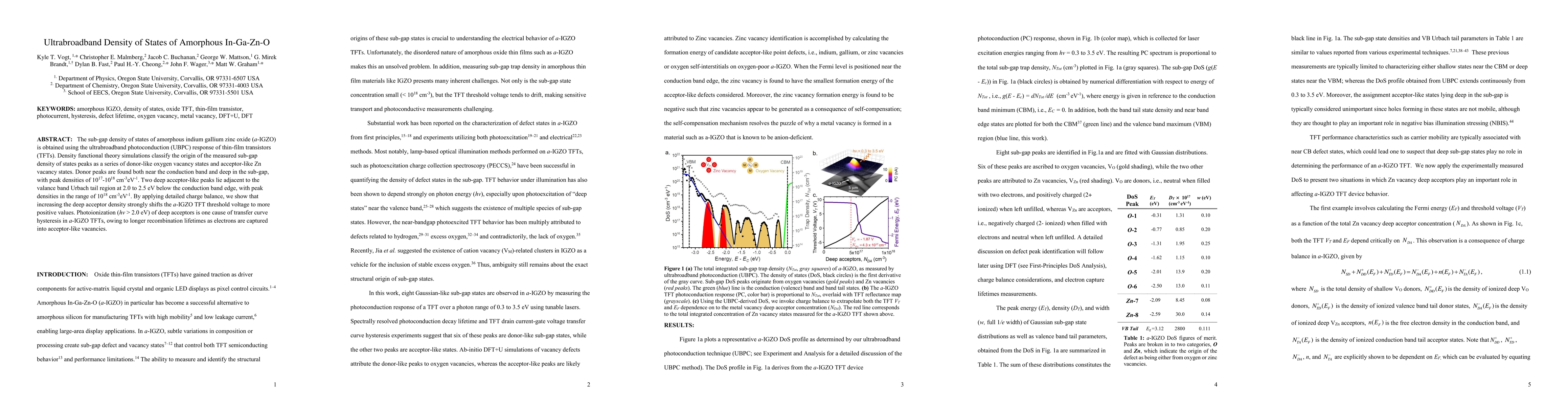 This paper investigates the ultrabroadband density of states of amorphous indium gallium zinc oxide ($a$-IGZO) using ultrabroadband photoconduction, identifying donor-like oxygen vacancies and acceptor-like Zn vacancies as primary contributors. The study reveals significant shifts in TFT threshold voltages and hysteresis due to metal vacancy acceptors.
