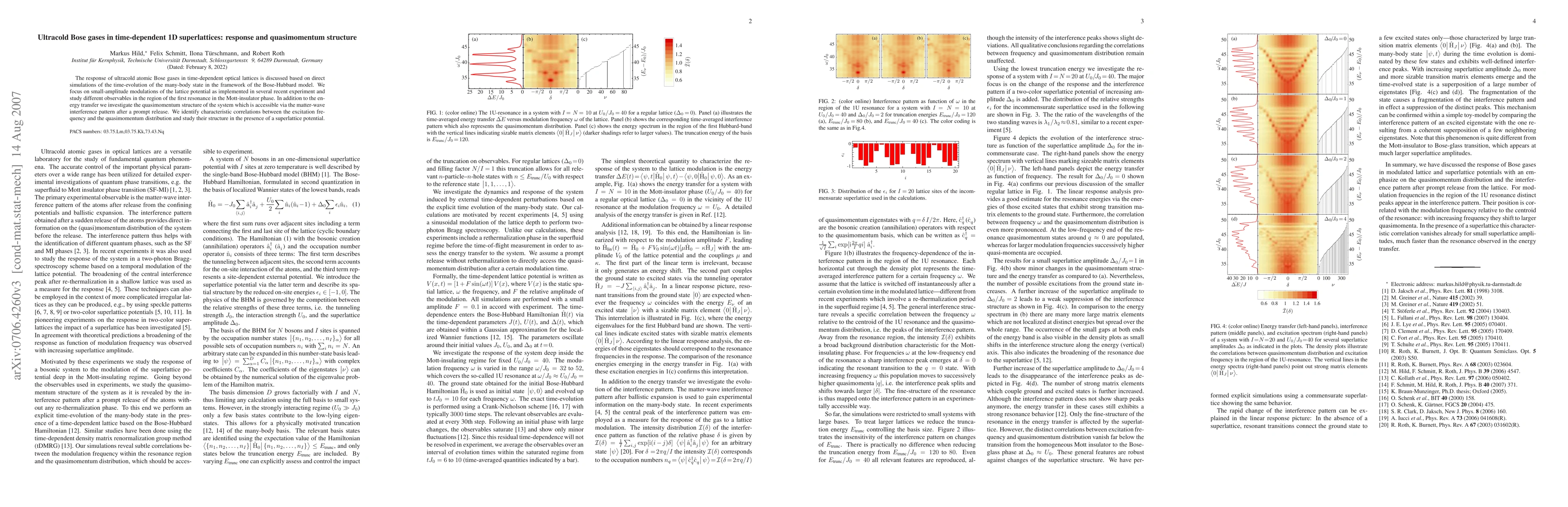 This paper investigates the response of ultracold Bose gases in time-dependent 1D optical superlattices using Bose-Hubbard model simulations. It examines energy transfer and quasimomentum structure via matter-wave interference patterns, revealing correlations between excitation frequency and quasimomentum distribution in the Mott-insulator phase.