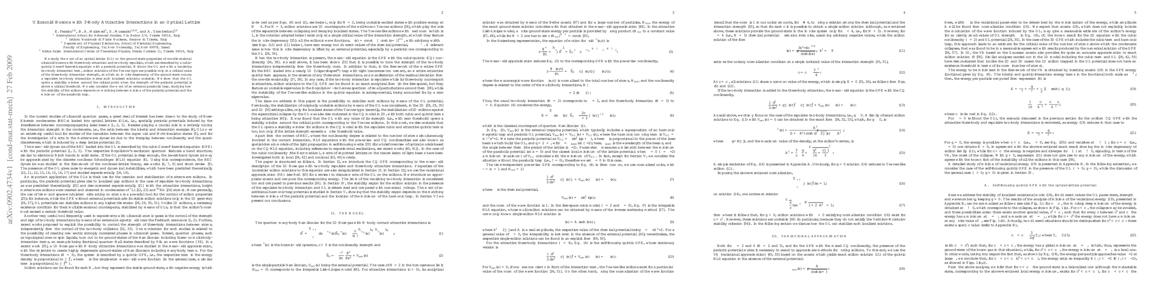 This paper investigates the ground-state properties of one-dimensional ultracold bosons with three-body attraction and two-body repulsion in an optical lattice, revealing that the lattice stabilizes soliton solutions near a critical interaction strength. The study also examines how an external parabolic trap influences soliton stability by aligning lattice and trap minima.
