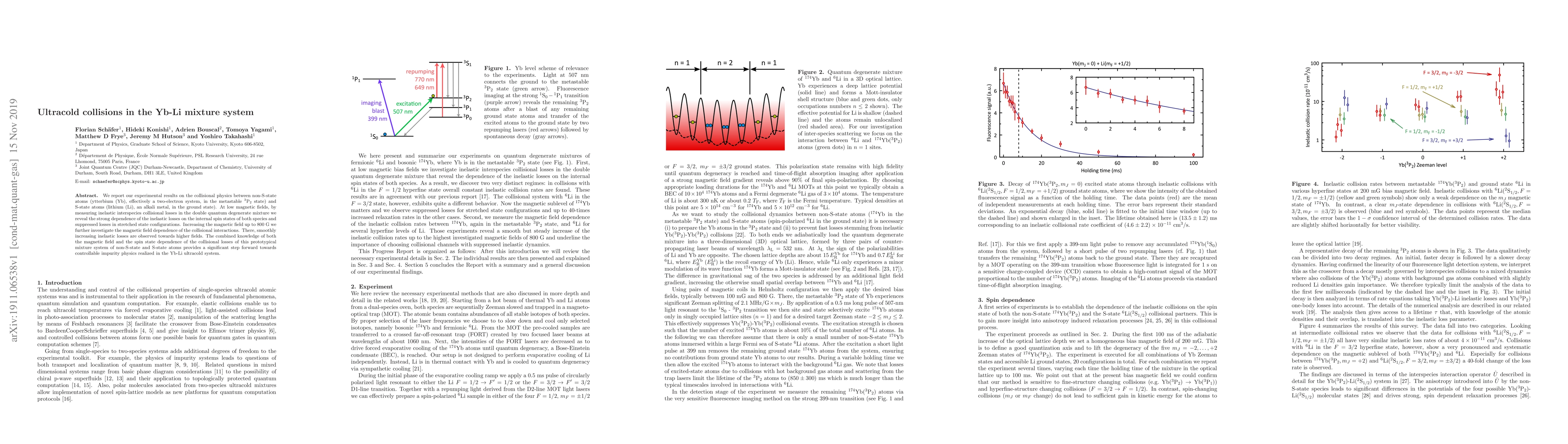 We report our experimental results on the collisional physics between non-S-state atoms (ytterbium (Yb), effectively a two-electron system, in the metastable ${}^3\mathrm{P}_2$ state) and S-state atoms (lithium (Li), an alkali metal, in the ground state). At low magnetic fields, by measuring inelastic interspecies collisional losses in the double quantum degenerate mixture we reveal the strong dependence of the inelastic losses on the internal spin states of both species and suppressed losses in stretched state configurations. Increasing the magnetic field up to 800 G we further investigate the magnetic field dependence of the collisional interactions. There, smoothly increasing inelastic losses are observed towards higher fields. The combined knowledge of both the magnetic field and the spin state dependence of the collisional losses of this prototypical mixture system of non-S-state and S-state atoms provides a significant step forward towards controllable impurity physics realized in the Yb-Li ultracold system.