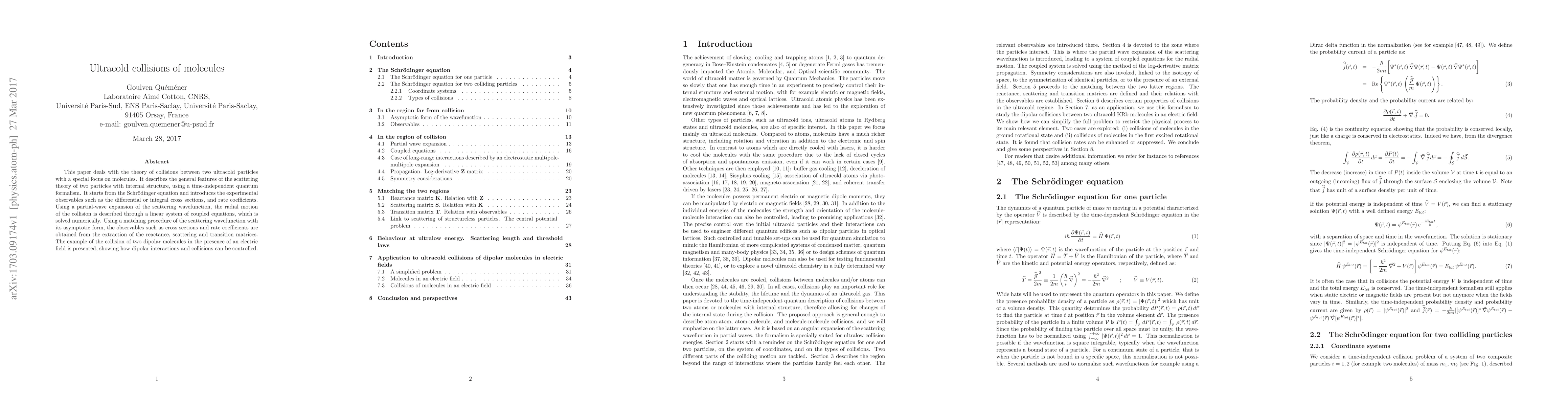 This paper develops a theoretical framework for ultracold molecular collisions, employing quantum scattering theory to describe the interactions and derive observables like cross sections and rate coefficients. It numerically solves a system of coupled equations to illustrate the control of dipolar interactions in the collision of two molecules under an electric field.