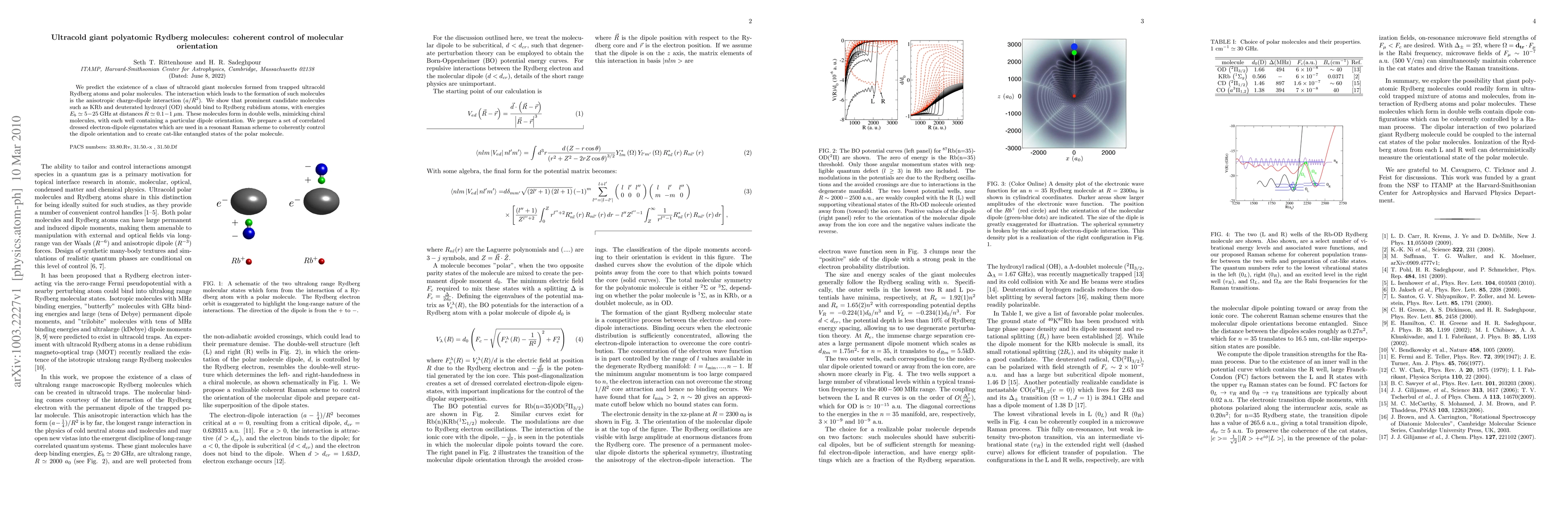 This paper predicts the formation of ultracold giant polyatomic Rydberg molecules through charge-dipole interactions, specifically focusing on KRb and OD molecules. It also proposes a resonant Raman scheme to coherently control the molecular dipole orientation and create entangled states.