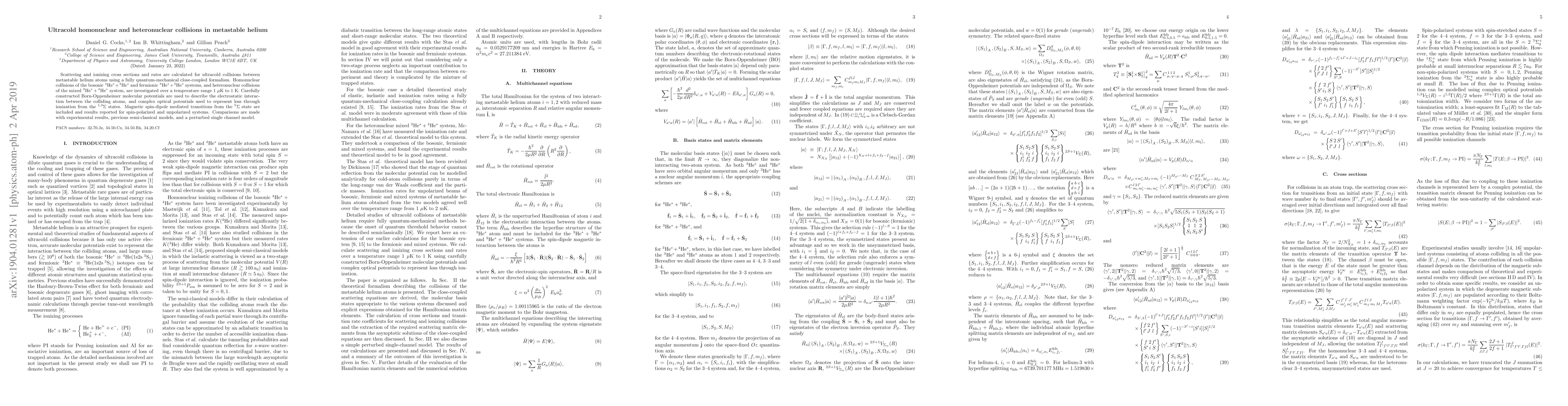 This paper calculates scattering and ionization cross sections for ultracold collisions of metastable helium atoms using quantum-mechanical close-coupled methods, investigating homonuclear and heteronuclear systems over a temperature range from 1 μK to 1 K, and compares results to experimental data and previous models.