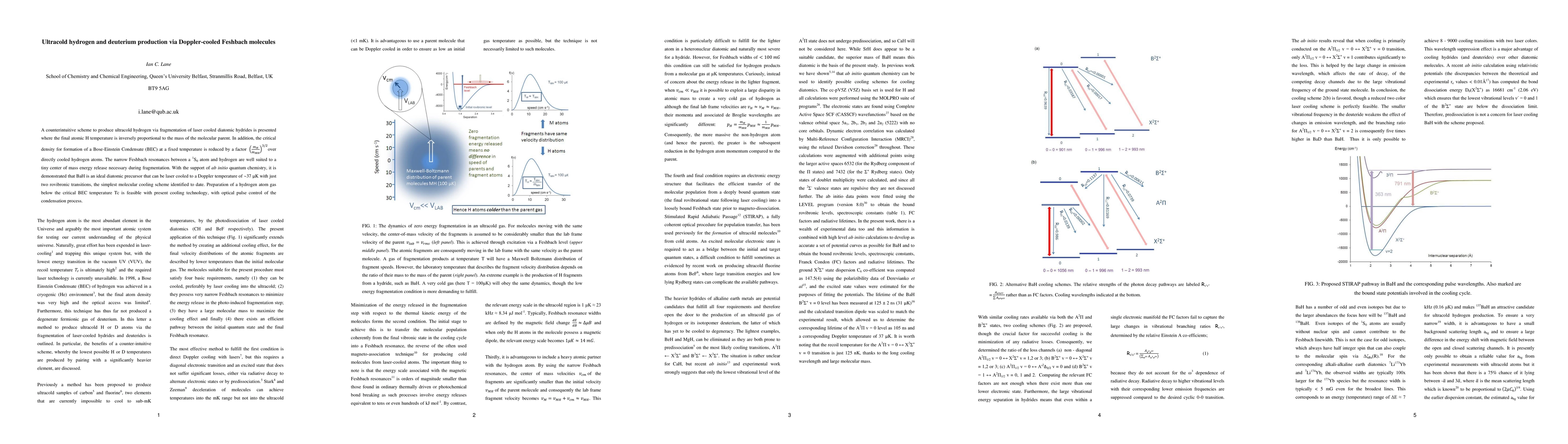 Researchers developed a method to produce ultracold hydrogen gas through Doppler-cooled Feshbach molecules, with a temperature inversely proportional to the molecular parent mass. The process uses laser-cooled diatomic hydrides as precursors, enabling the creation of hydrogen atoms below the critical temperature for Bose-Einstein condensation.