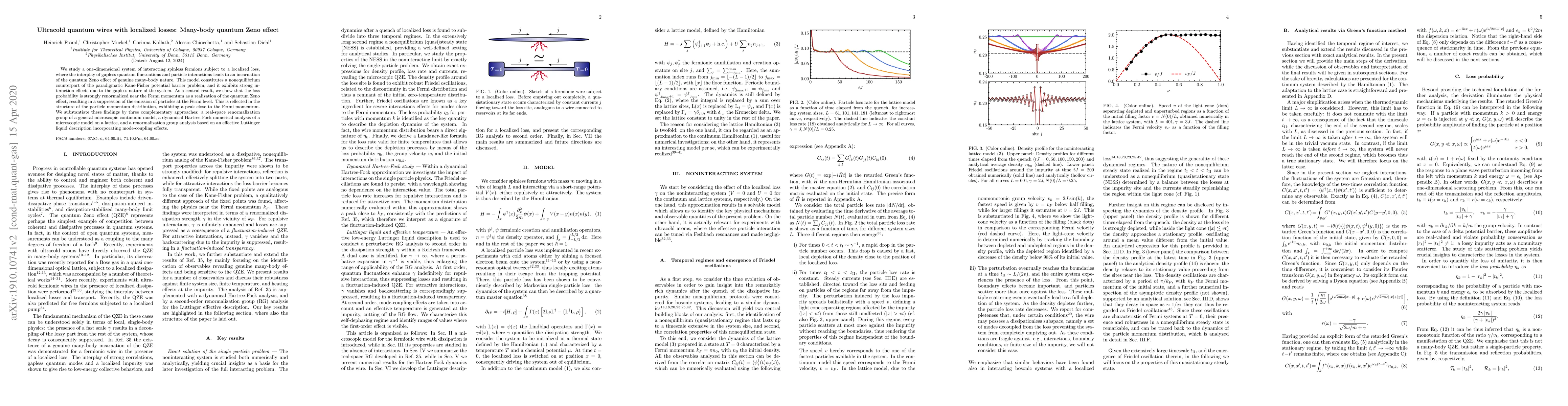 Researchers studied a system of interacting spinless fermions with localized losses, finding that it exhibits the quantum Zeno effect, where particle emission is suppressed near the Fermi momentum.