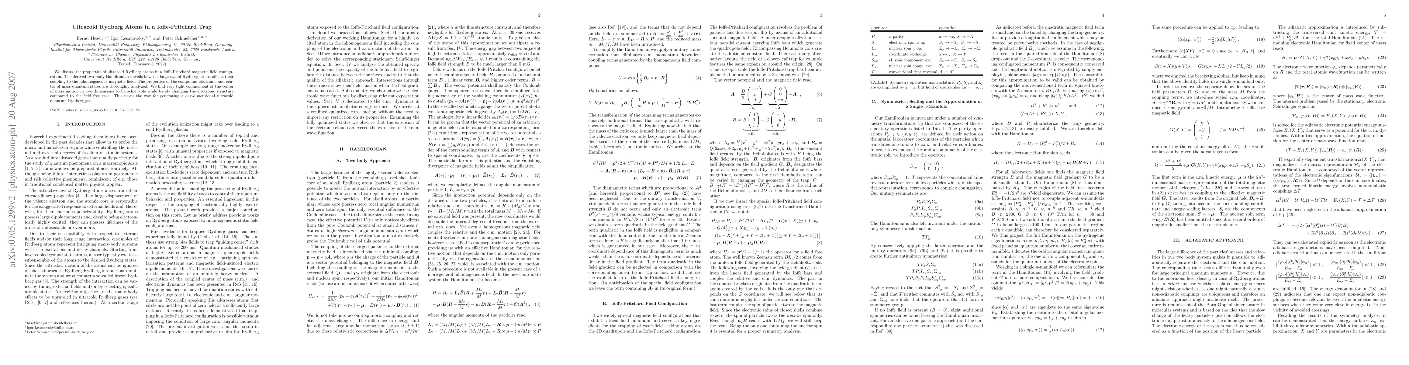 We discuss the properties of ultracold Rydberg atoms in a Ioffe-Pritchard magnetic field configuration. The derived two-body Hamiltonian unveils how the large size of Rydberg atoms affects their coupling to the inhomogeneous magnetic field. The properties of the compound electronic and center of mass quantum states are thoroughly analyzed. We find very tight confinement of the center of mass motion in two dimensions to be achievable while barely changing the electronic structure compared to the field free case. This paves the way for generating a one-dimensional ultracold quantum Rydberg gas.