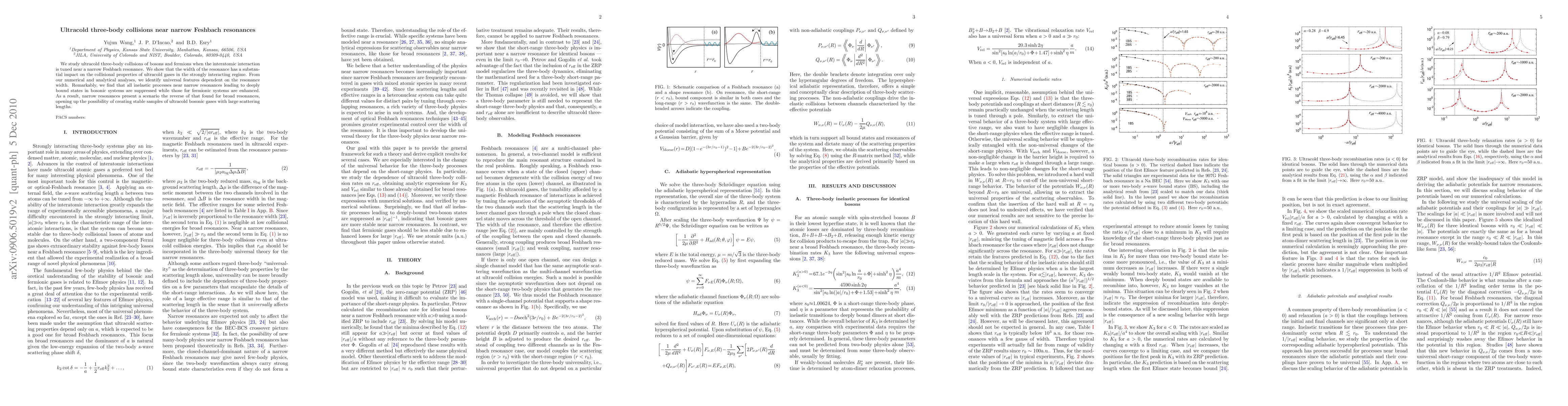 This paper investigates ultracold three-body collisions involving bosons and fermions near narrow Feshbach resonances, revealing that the resonance width significantly influences collisional properties. It identifies universal features related to the resonance width, showing suppression of inelastic processes and formation of deeply bound states in boson systems, and an enhancement in fermion systems.