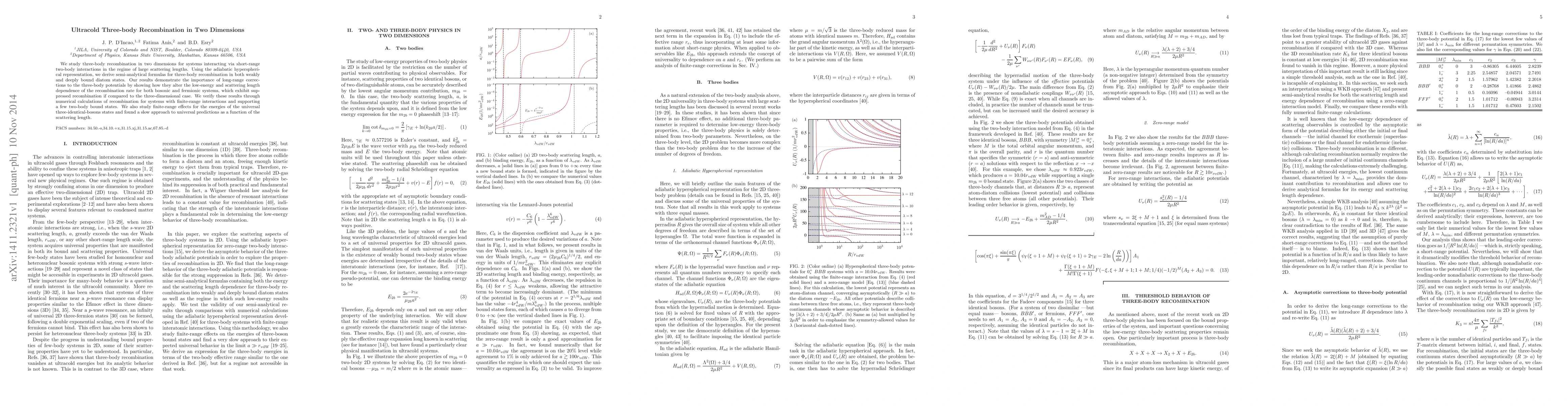 This paper investigates three-body recombination in two-dimensional systems with short-range interactions, deriving semi-analytical formulas that highlight the impact of long-range corrections on recombination rates. Numerical calculations confirm the suppression of recombination in two dimensions compared to three dimensions, and finite-range effects on three-boson state energies are also studied.