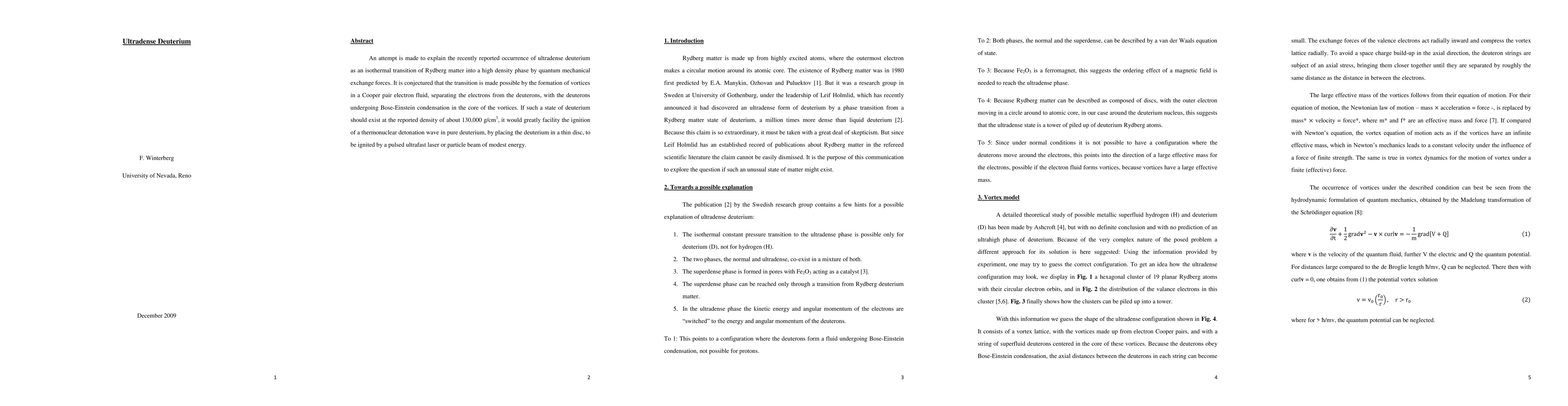 An attempt is made to explain the recently reported occurrence of ultradense deuterium as an isothermal transition of Rydberg matter into a high density phase by quantum mechanical exchange forces. It is conjectured that the transition is made possible by the formation of vortices in a Cooper pair electron fluid, separating the electrons from the deuterons, with the deuterons undergoing Bose-Einstein condensation in the core of the vortices. If such a state of deuterium should exist at the reported density of about 100,000 g/cm3, it would greatly facility the ignition of a thermonuclear detonation wave in pure deuterium, by placing the deuterium in a thin disc, to be ignited by a pulsed ultrafast laser or particle beam of modest energy.