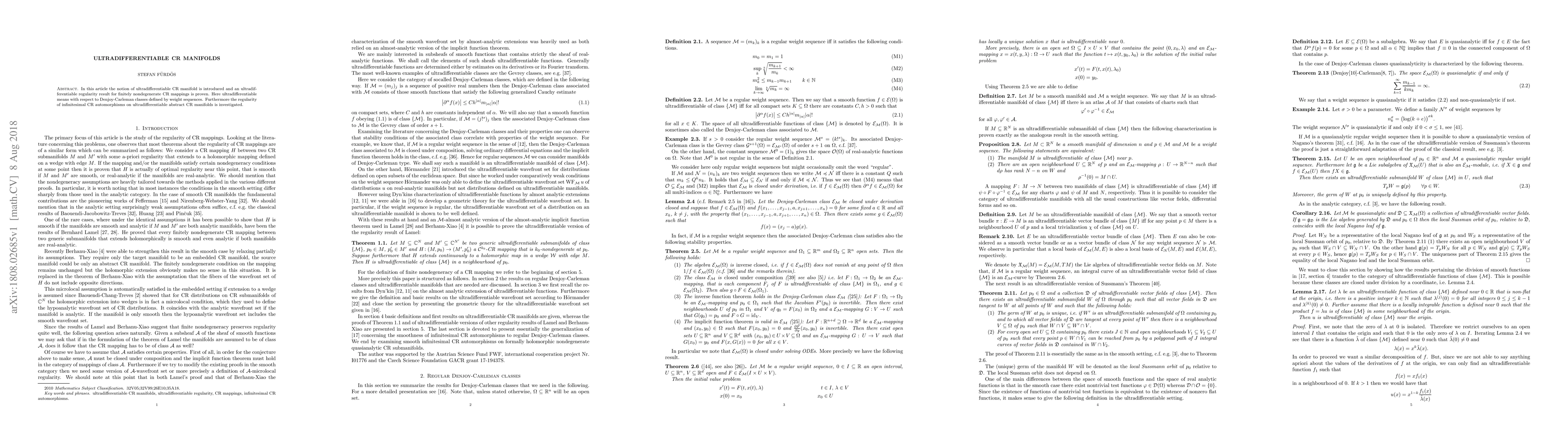 In this article the notion of ultradifferentiable CR manifold is introduced and an ultradifferentiable regularity result for finitely nondegenerate CR mappings is proven. Here ultradifferentiable means with respect to Denjoy-Carleman classes defined by weight sequences. Furthermore the regularity of infinitesimal CR automorphisms on ultradifferentiable abstract CR manifolds is investigated.
