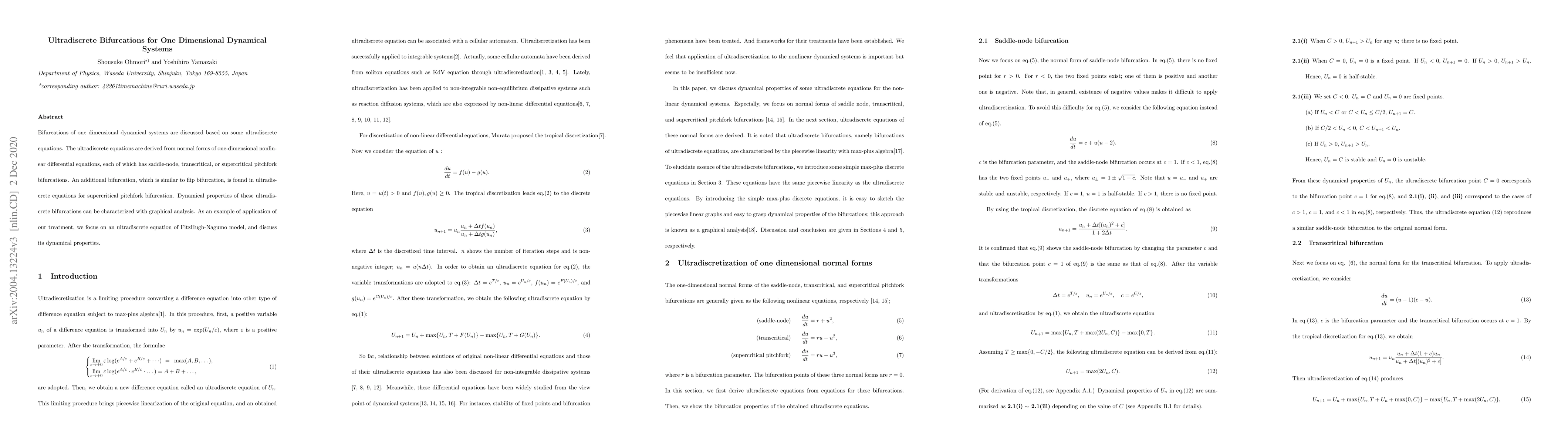 Bifurcations of one dimensional dynamical systems are discussed based on some ultradiscrete equations. The ultradiscrete equations are derived from normal forms of one-dimensional nonlinear differential equations, each of which has saddle-node, transcritical, or supercritical pitchfork bifurcations. An additional bifurcation, which is similar to flip bifurcation, is found in ultradiscrete equations for supercritical pitchfork bifurcation. Dynamical properties of these ultradiscrete bifurcations can be characterized with graphical analysis. As an example of application of our treatment, we focus on an ultradiscrete equation of FitzHugh-Nagumo model, and discuss its dynamical properties.