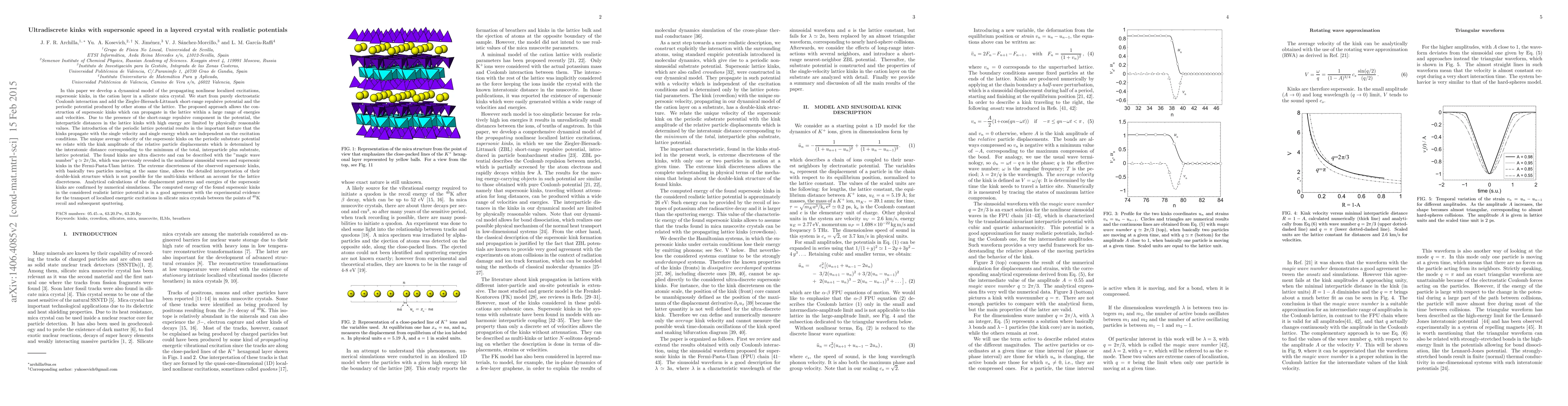 We develop a dynamical model of the propagating nonlinear localized excitations, supersonic kinks, in the cation layer in a silicate mica crystal. We start from purely electrostatic Coulomb interaction and add the Ziegler-Biersack-Littmark short-range repulsive potential and the periodic potential produced by other atoms of the lattice. This approach allows the construction of supersonic kinks which can propagate in the lattice within a large range of energies and velocities. The interparticle distances in the lattice kinks with high energy are physically reasonable values. The introduction of the periodic lattice potential results in the important feature that the kinks propagate with a single velocity and a single energy which are independent on the excitation conditions. The found kinks are ultra-discrete and can be described with the "magic wave number" $q\simeq 2\pi/3a$, which was previously revealed in the nonlinear sinusoidal waves and supersonic kinks in the Fermi-Pasta-Ulam lattice. The extreme discreteness of the supersonic kinks, with basically two particles moving at the same time, allows the interpretation of their double-kink structure. The energy of the supersonic kinks is between the possible source of $^{40}$K recoil in beta decay and the energy necessary for the ejection of an atom at the border as has been found experimentally.