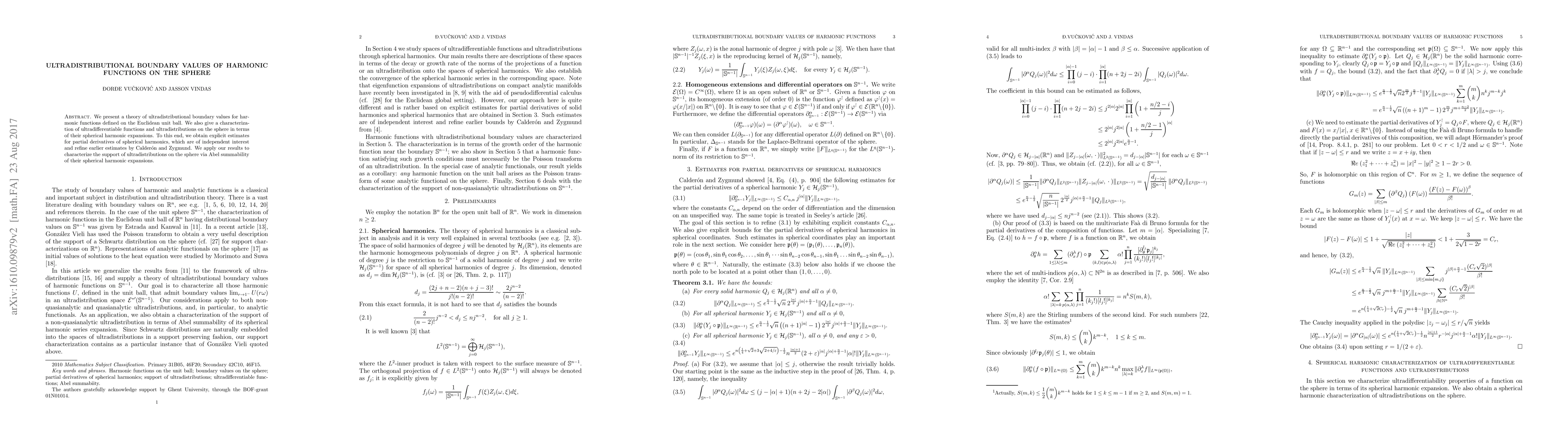 This paper develops a theory for ultradistributional boundary values of harmonic functions on the sphere, characterized via spherical harmonic expansions, and refines earlier estimates for partial derivatives of spherical harmonics. The results are applied to define the support of ultradistributions on the sphere through Abel summability.