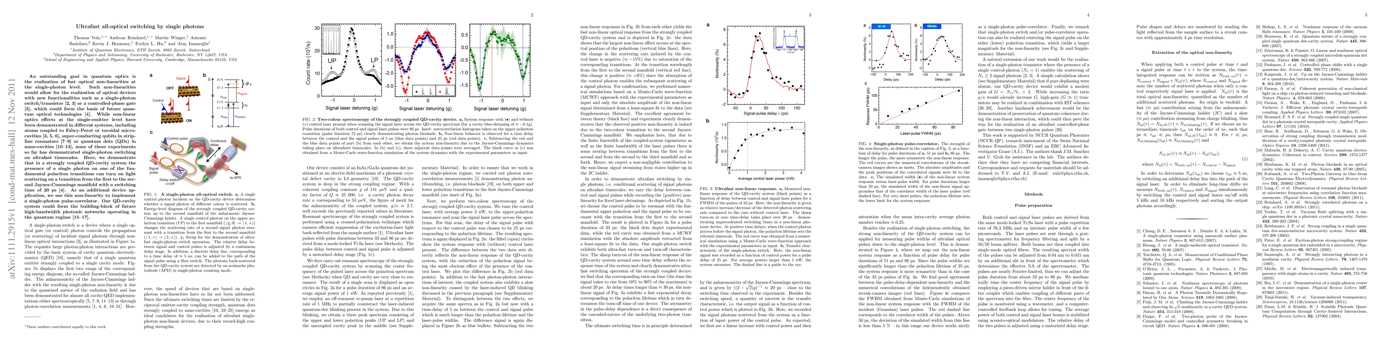 This paper demonstrates ultrafast all-optical switching by single photons in a strongly coupled quantum dot-cavity system, achieving a switching time of 20 ps. The system enables new functionalities like single-photon switches and pulse-correlators, potentially forming the basis for future quantum optical technologies.