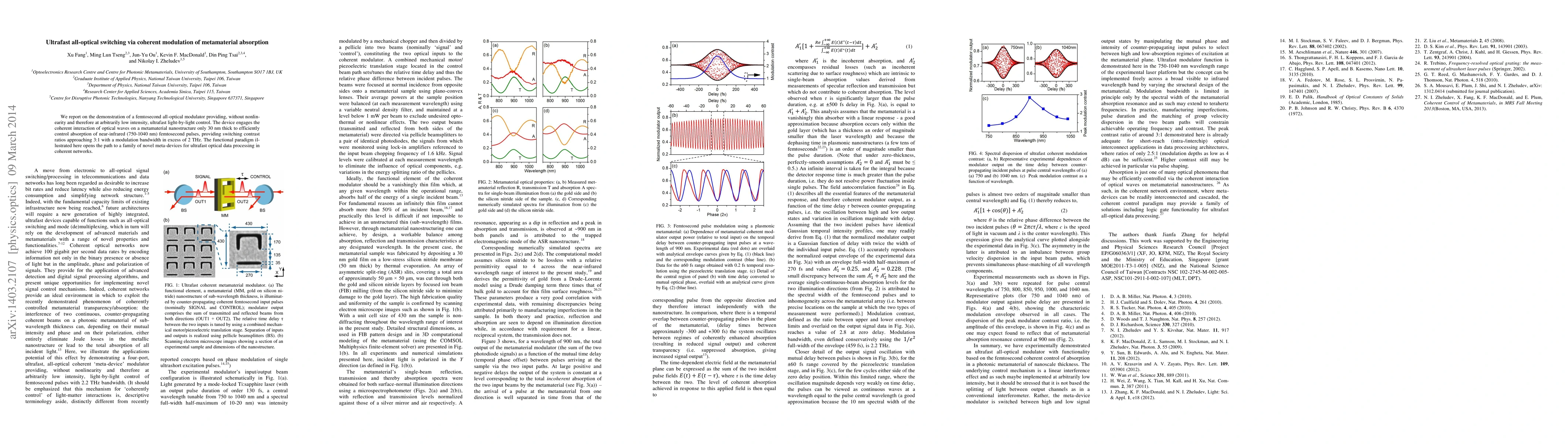 This paper demonstrates a femtosecond all-optical modulator that uses coherent modulation of a 30 nm thick metamaterial nanostructure to achieve ultrafast light-by-light control without nonlinearity. The device efficiently controls near-infrared femtosecond pulse absorption, offering high switching contrast ratios and a modulation bandwidth exceeding 2 THz.
