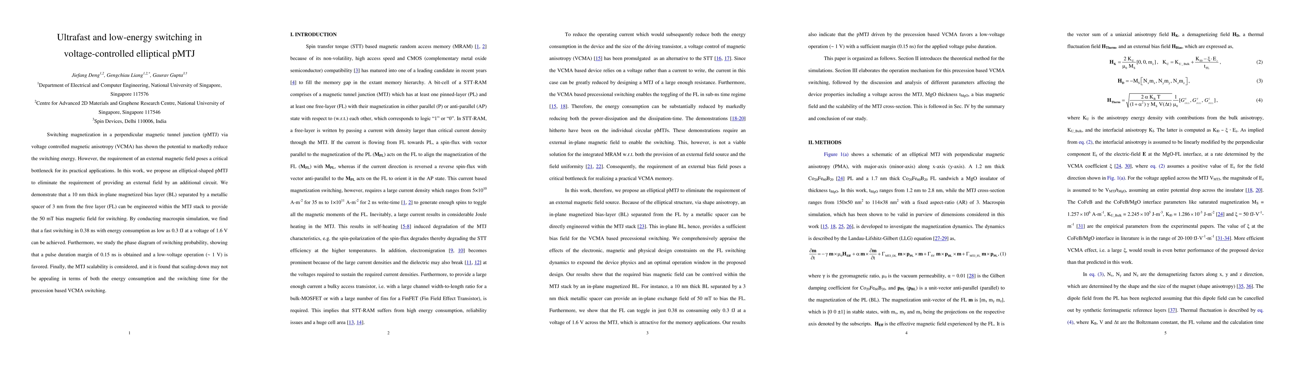 This paper proposes an elliptical-shaped perpendicular magnetic tunnel junction (pMTJ) to achieve ultrafast and low-energy switching via voltage-controlled magnetic anisotropy (VCMA) without requiring an external magnetic field. The design utilizes an in-plane magnetized bias layer to provide the necessary bias field, achieving fast switching in 0.38 ns with minimal energy consumption of 0.3 fJ at 1.6 V.
