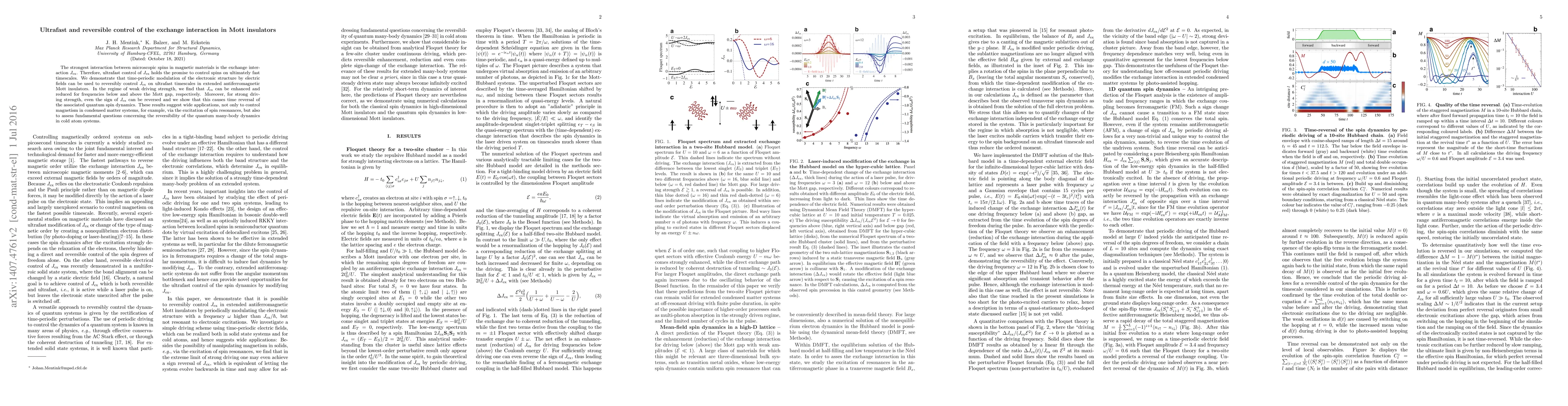 This paper demonstrates ultrafast and reversible control of the exchange interaction $J_\text{ex}$ in antiferromagnetic Mott insulators using electric fields, showing that the sign of $J_\text{ex}$ can be reversed and the spin dynamics can be time-reversed, with potential applications in controlling magnetism and studying quantum many-body dynamics.