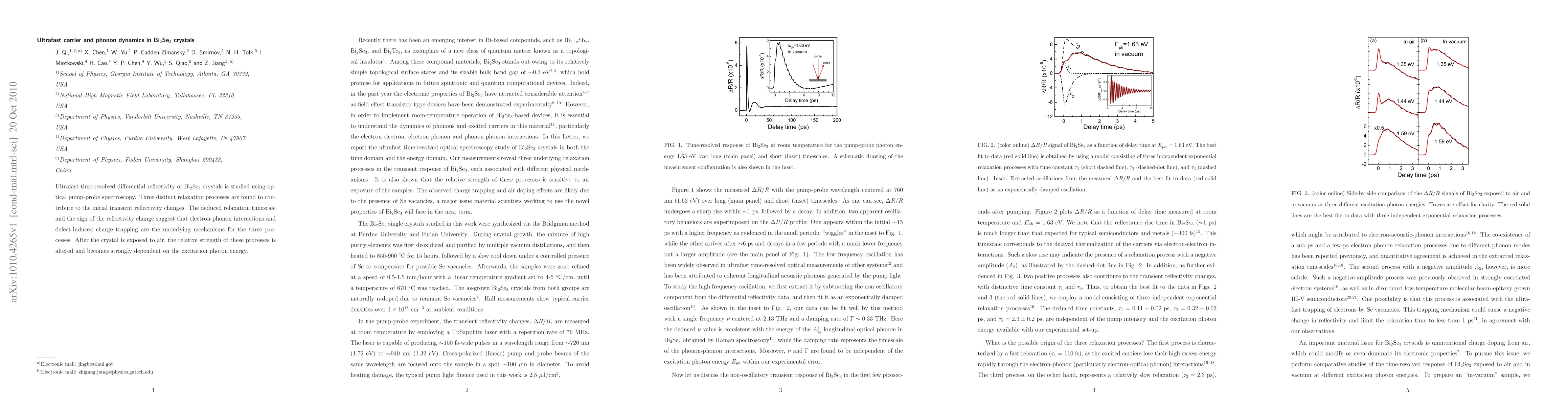 Research in Bi2Se3 crystals reveals three ultrafast relaxation processes that involve electron-phonon interactions and defect-induced charge trapping, with the relative strength of these processes changing depending on photon energy after exposure to air.