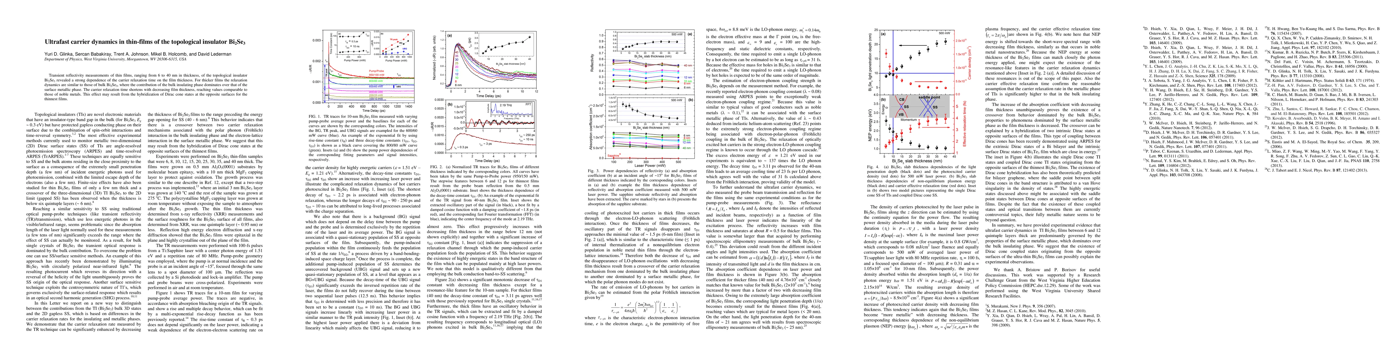 This research demonstrates that in thin films of the topological insulator Bi2Se3, carrier relaxation times vary significantly with film thickness, shortening dramatically in ultrathin films, potentially due to surface-state hybridization, contrasting with thicker films where bulk insulating properties dominate.