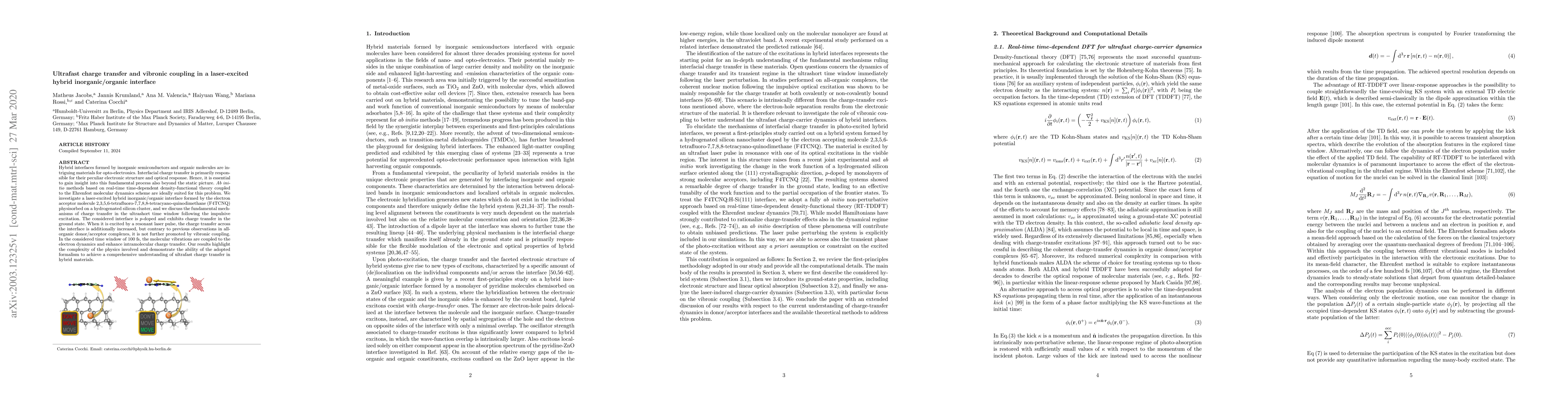Hybrid interfaces formed by inorganic semiconductors and organic molecules are intriguing materials for opto-electronics. Interfacial charge transfer is primarily responsible for their peculiar electronic structure and optical response. Hence, it is essential to gain insight into this fundamental process also beyond the static picture. Ab initio methods based on real-time time-dependent density-functional theory coupled to the Ehrenfest molecular dynamics scheme are ideally suited for this problem. We investigate a laser-excited hybrid inorganic/organic interface formed by the electron acceptor molecule 2,3,5,6-tetrafluoro-7,7,8,8-tetracyano-quinodimethane (F4TCNQ) physisorbed on a hydrogenated silicon cluster, and we discuss the fundamental mechanisms of charge transfer in the ultrashort time window following the impulsive excitation. The considered interface is $p$-doped and exhibits charge transfer in the ground state. When it is excited by a resonant laser pulse, the charge transfer across the interface is additionally increased, but contrary to previous observations in all-organic donor/acceptor complexes, it is not further promoted by vibronic coupling. In the considered time window of 100~fs, the molecular vibrations are coupled to the electron dynamics and enhance intramolecular charge transfer. Our results highlight the complexity of the physics involved and demonstrate the ability of the adopted formalism to achieve a comprehensive understanding of ultrafast charge transfer in hybrid materials.
