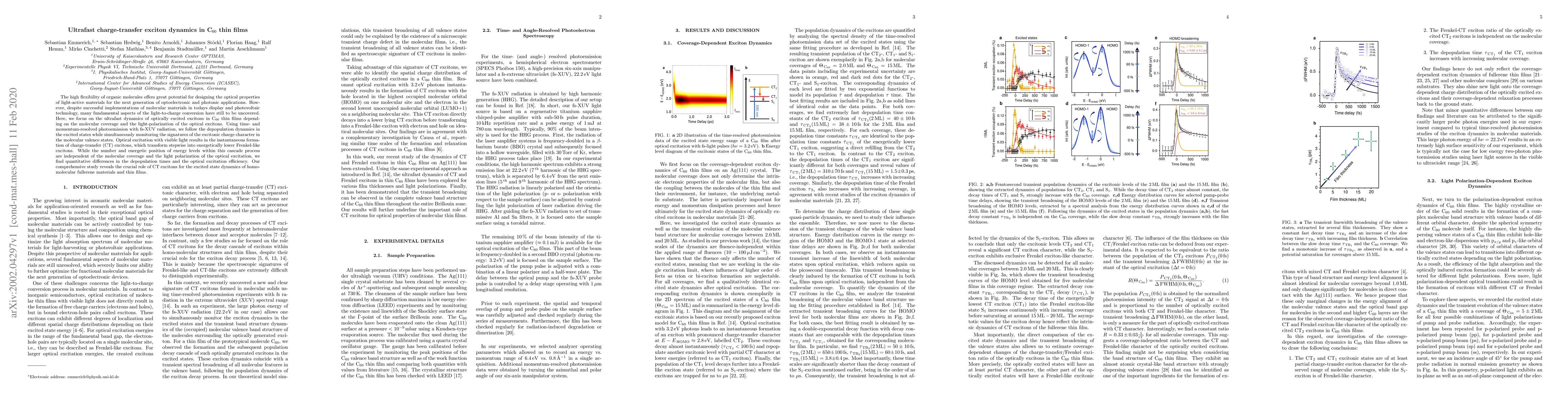 Researchers studied ultrafast charge-transfer exciton dynamics in C60 thin films, finding that optical excitation creates charge-transfer excitons that transform into energetically lower Frenkel-like excitons, with differences in depopulation times and efficiency depending on molecular coverage and light polarization.
