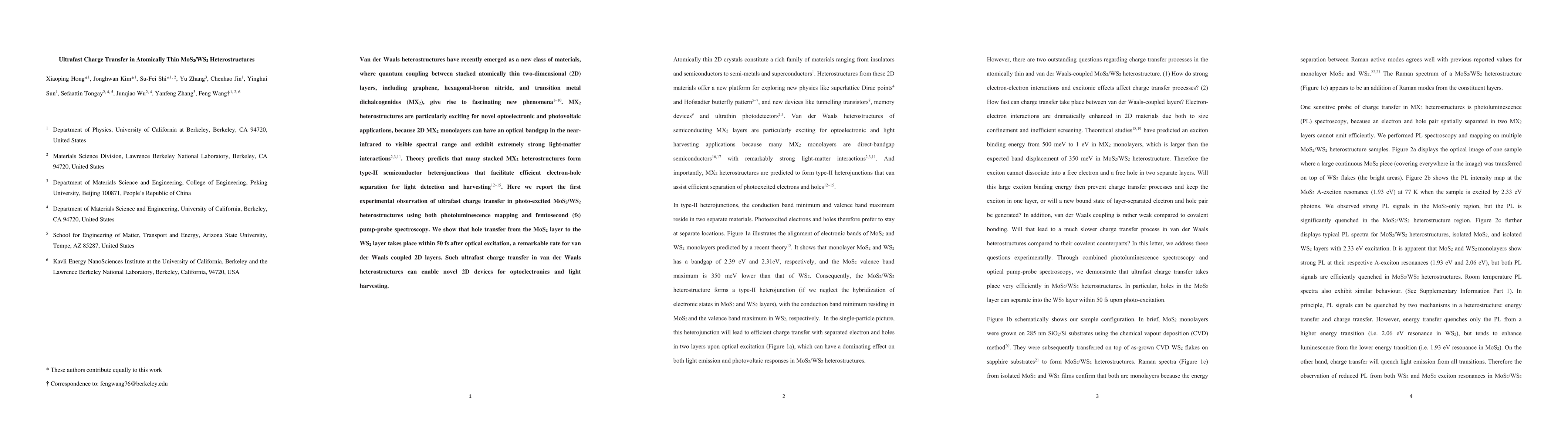 This study reports the first experimental observation of ultrafast charge transfer within 50 fs in photo-excited MoS2/WS2 van der Waals heterostructures, utilizing photoluminescence mapping and femtosecond pump-probe spectroscopy. The findings suggest potential for advanced optoelectronic and photovoltaic applications.