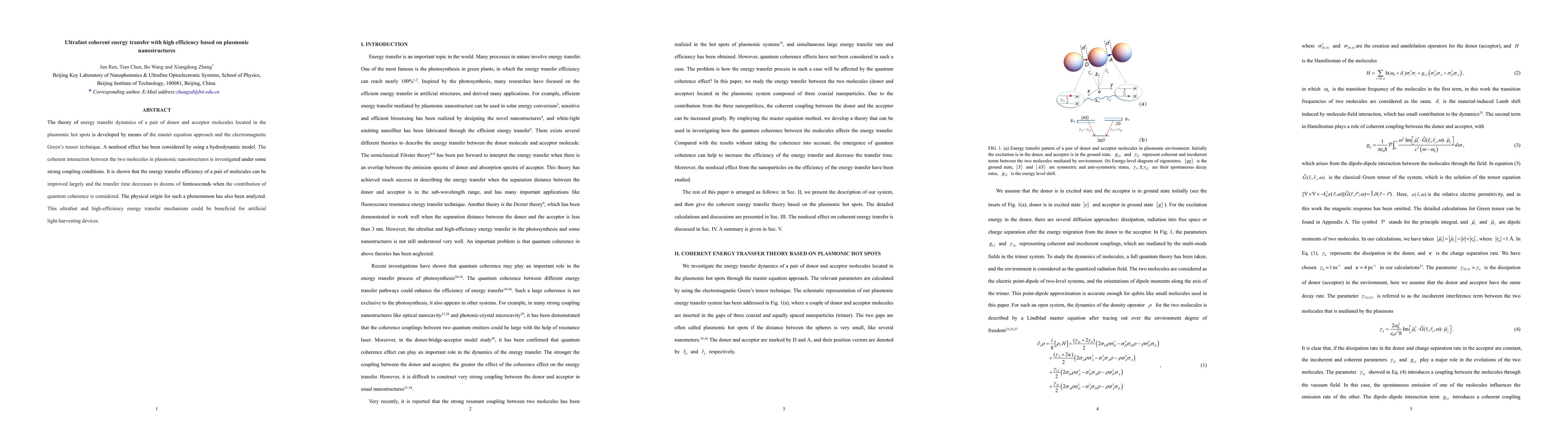 This paper develops a theoretical framework for ultrafast, high-efficiency coherent energy transfer between donor and acceptor molecules in plasmonic nanostructures, showing that quantum coherence can significantly reduce transfer time to femtoseconds. The findings suggest potential applications in advanced light-harvesting technologies.