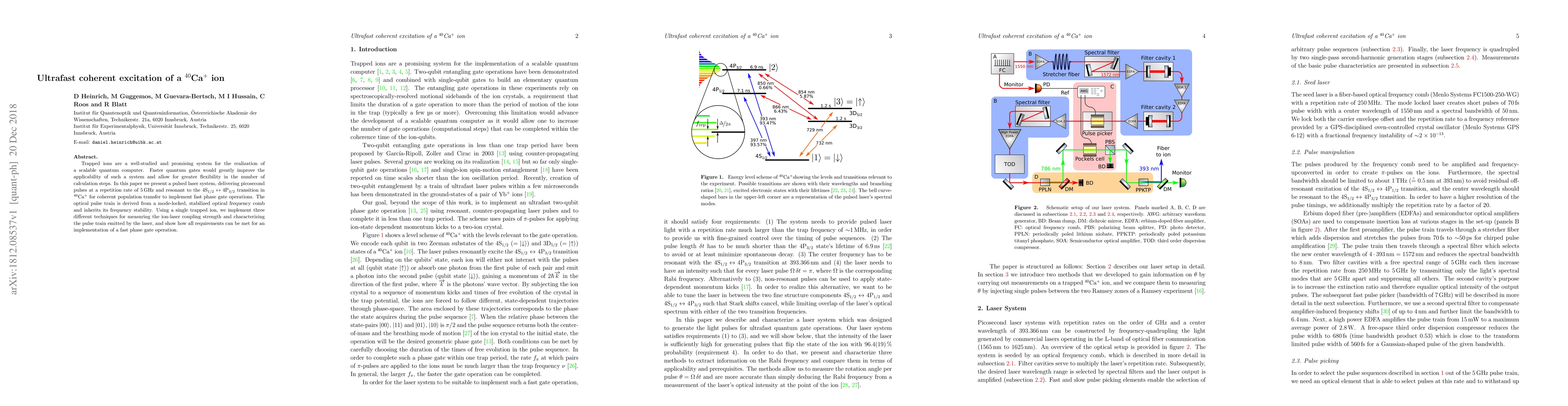 Trapped ions are a well-studied and promising system for the realization of a scalable quantum computer. Faster quantum gates would greatly improve the applicability of such a system and allow for greater flexibility in the number of calculation steps. In this paper we present a pulsed laser system, delivering picosecond pulses at a repetition rate of 5 GHz and resonant to the S$_{1/2}$ to P$_{3/2}$ transition in Ca$^+$ for coherent population transfer to implement fast phase gate operations. The optical pulse train is derived from a mode-locked, stabilized optical frequency comb and inherits its frequency stability. Using a single trapped ion, we implement three different techniques for measuring the ion-laser coupling strength and characterizing the pulse train emitted by the laser, and show how all requirements can be met for an implementation of a fast phase gate operation.