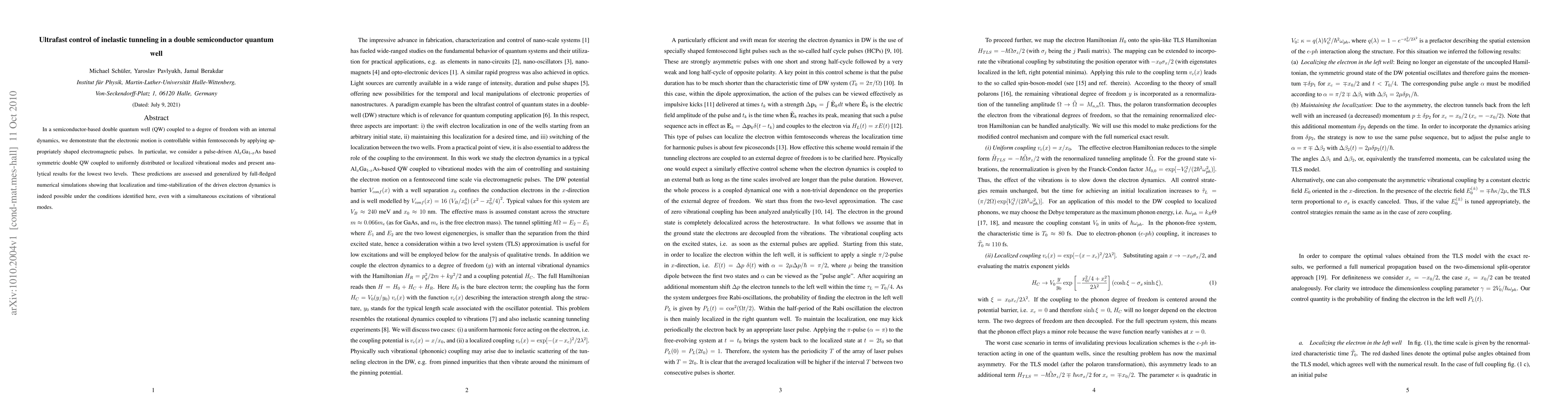 In a semiconductor-based double quantum well (QW) coupled to a degree of freedom with an internal dynamics, we demonstrate that the electronic motion is controllable within femtoseconds by applying appropriately shaped electromagnetic pulses. In particular, we consider a pulse-driven AlxGa1-xAs based symmetric double QW coupled to uniformly distributed or localized vibrational modes and present analytical results for the lowest two levels. These predictions are assessed and generalized by full-fledged numerical simulations showing that localization and time-stabilization of the driven electron dynamics is indeed possible under the conditions identified here, even with a simultaneous excitations of vibrational modes.
