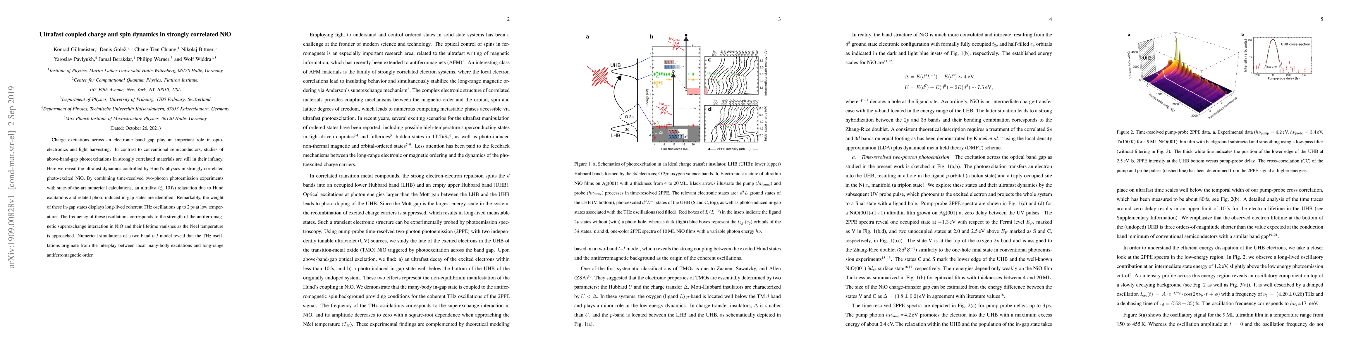 This paper investigates ultrafast charge and spin dynamics in photo-excited NiO, revealing an ultrafast relaxation mechanism driven by Hund's physics and identifying long-lived coherent THz oscillations linked to antiferromagnetic superexchange interactions. The study combines experimental and computational methods to uncover the dynamics of strongly correlated materials.