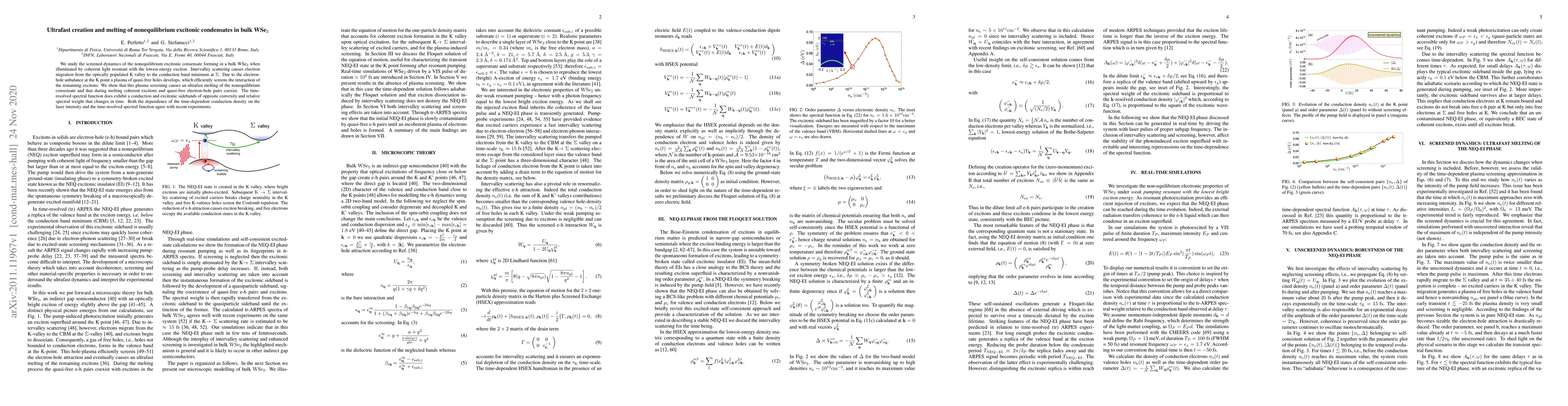 We study the screened dynamics of the nonequilibrium excitonic consensate forming in a bulk WSe$_{2}$ when illuminated by coherent light resonant with the lowest-energy exciton. Intervalley scattering causes electron migration from the optically populated K valley to the conduction band minimum at $\Sigma$. Due to the electron-hole unbalance at the K point a plasma of quasi-free holes develops, which efficiently screens the interaction of the remaining excitons. We show that this plasma screening causes an ultrafast melting of the nonequilibrium consensate and that during melting coherent excitons and quasi-free electron-hole pairs coexist. The time-resolved spectral function does exhibit a conduction and excitonic sidebands of opposite convexity and relative spectral weight that changes in time. Both the dependence of the time-dependent conduction density on the laser intensity and the time-resolved spectral function agree with recent experiments.
