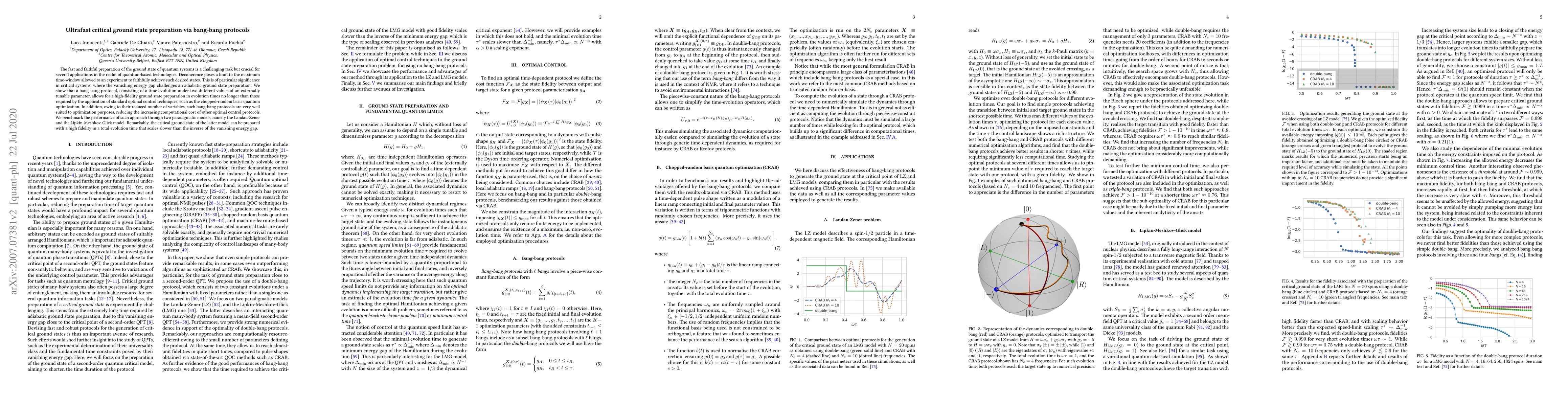 The fast and faithful preparation of the ground state of quantum systems is a challenging task but crucial for several applications in the realm of quantum-based technologies. Decoherence poses a limit to the maximum time-window allowed to an experiment to faithfully achieve such desired states. This is of particular significance in critical systems, where the vanishing energy gap challenges an adiabatic ground state preparation. We show that a bang-bang protocol, consisting of a time evolution under two different values of an externally tunable parameter, allows for a high-fidelity ground state preparation in evolution times no longer than those required by the application of standard optimal control techniques, such as the chopped-random basis quantum optimization. In addition, owing to their reduced number of variables, such bang-bang protocols are very well suited to optimization purposes, reducing the increasing computational cost of other optimal control protocols. We benchmark the performance of such approach through two paradigmatic models, namely the Landau-Zener and the Lipkin-Meshkov-Glick model. Remarkably, the critical ground state of the latter model can be prepared with a high fidelity in a total evolution time that scales slower than the inverse of the vanishing energy gap.