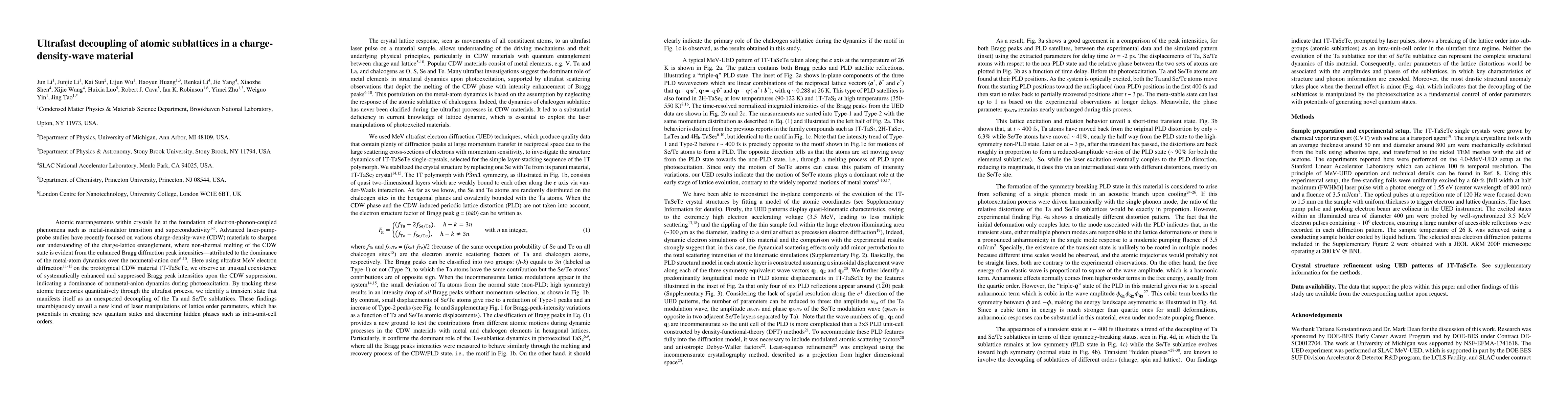 This study reveals ultrafast decoupling of atomic sublattices in a charge-density-wave material using ultrafast MeV electron diffraction, showing enhanced and suppressed Bragg peak intensities indicative of nonmetal-anion dynamics dominance during CDW suppression. The findings highlight a novel transient state with potential for creating new quantum states and revealing hidden phases.