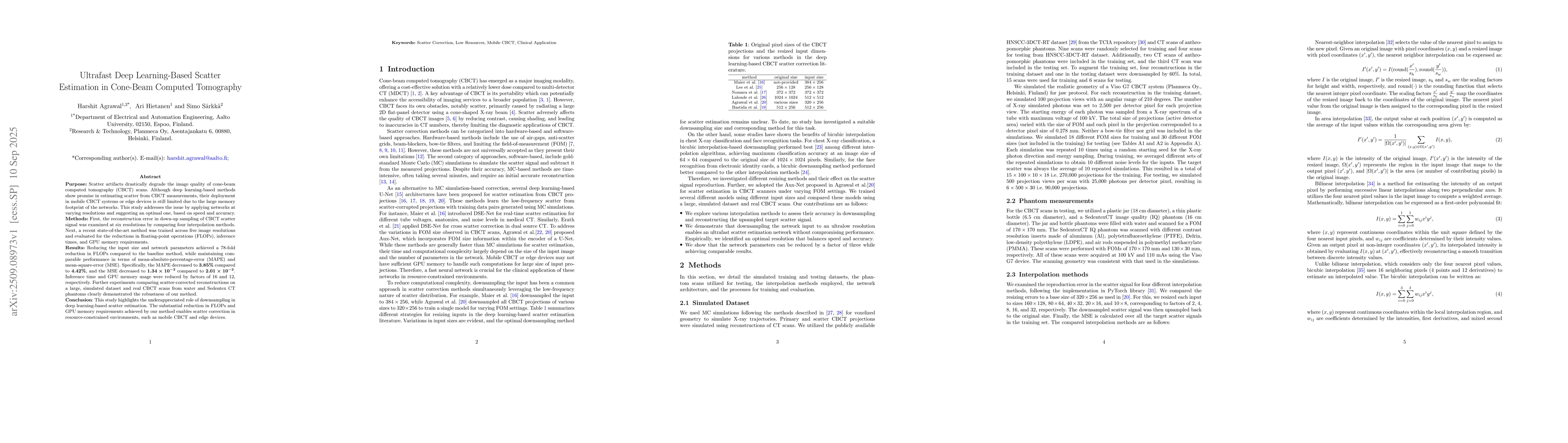 Purpose: Scatter artifacts drastically degrade the image quality of cone-beam computed tomography (CBCT) scans. Although deep learning-based methods show promise in estimating scatter from CBCT measurements, their deployment in mobile CBCT systems or edge devices is still limited due to the large memory footprint of the networks. This study addresses the issue by applying networks at varying resolutions and suggesting an optimal one, based on speed and accuracy. Methods: First, the reconstruction error in down-up sampling of CBCT scatter signal was examined at six resolutions by comparing four interpolation methods. Next, a recent state-of-the-art method was trained across five image resolutions and evaluated for the reductions in floating-point operations (FLOPs), inference times, and GPU memory requirements. Results: Reducing the input size and network parameters achieved a 78-fold reduction in FLOPs compared to the baseline method, while maintaining comarable performance in terms of mean-absolute-percentage-error (MAPE) and mean-square-error (MSE). Specifically, the MAPE decreased to 3.85% compared to 4.42%, and the MSE decreased to 1.34 \times 10^{-2} compared to 2.01 \times 10^{-2}. Inference time and GPU memory usage were reduced by factors of 16 and 12, respectively. Further experiments comparing scatter-corrected reconstructions on a large, simulated dataset and real CBCT scans from water and Sedentex CT phantoms clearly demonstrated the robustness of our method. Conclusion: This study highlights the underappreciated role of downsampling in deep learning-based scatter estimation. The substantial reduction in FLOPs and GPU memory requirements achieved by our method enables scatter correction in resource-constrained environments, such as mobile CBCT and edge devices.