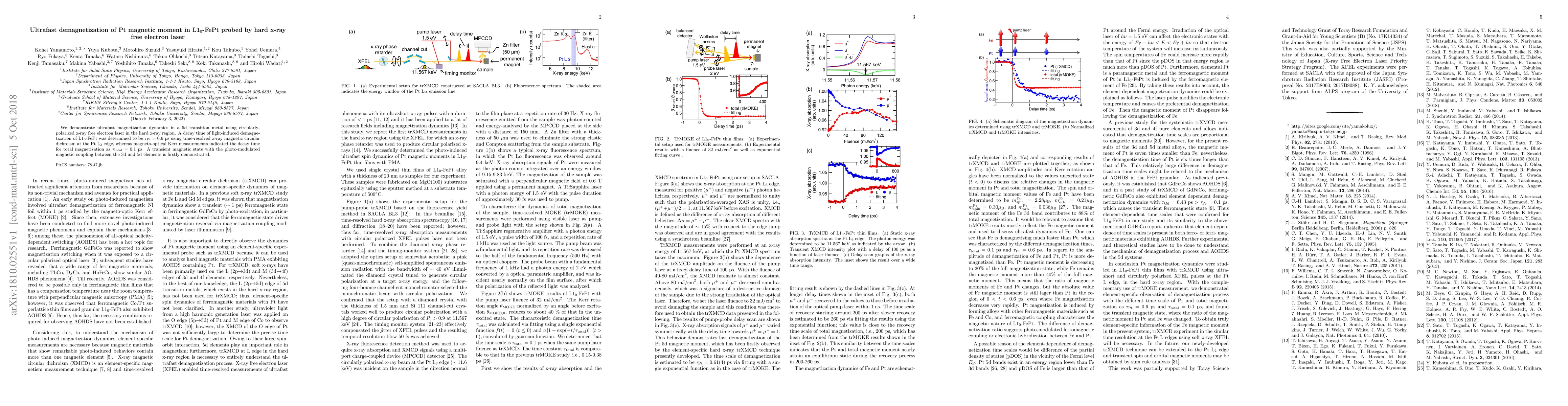 This paper investigates ultrafast demagnetization dynamics in L1${}_0$-FePt using a hard x-ray free electron laser, revealing a decay time of 0.6 ps for Pt magnetic moment demagnetization and 0.1 ps for total magnetization, showcasing a transient magnetic state with photo-modulated coupling between 3d and 5d elements.