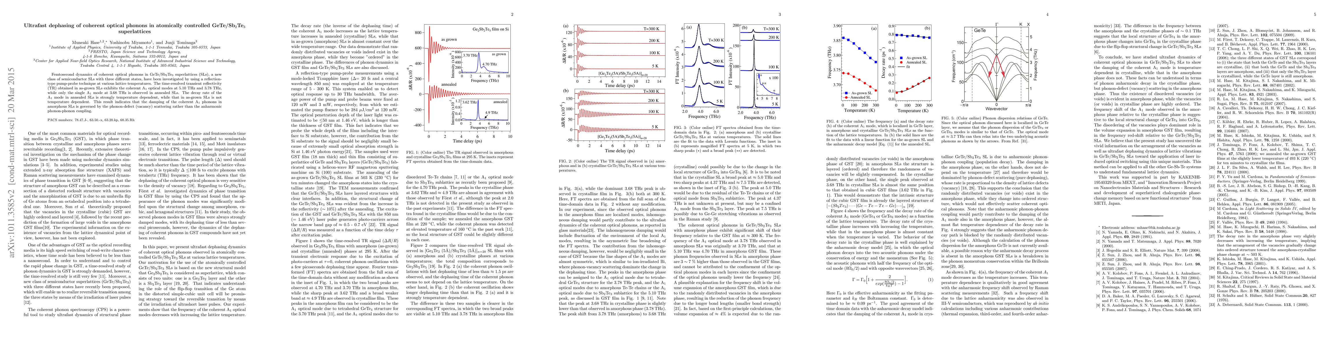 Femtosecond dynamics of coherent optical phonons in GeTe/Sb$_{2}$Te$_{3}$ superlattices (SLs), a new class of semiconductor SLs with three different states, have been investigated by using a reflection-type pump-probe technique at various lattice temperatures. The time-resolved transient reflectivity (TR) obtained in as-grown SLs exhibits the coherent A$_{1}$ optical modes at 5.10 THz and 3.78 THz, while only the single A$_{1}$ mode at 3.68 THz is observed in annealed SLs. The decay rate of the A$_{1}$ mode in annealed SLs is strongly temperature dependent, while that in as-grown SLs is not temperature dependent. This result indicates that the damping of the coherent A$_{1}$ phonons in amorphous SLs is governed by the phonon-defect (vacancy) scattering rather than the anharmonic phonon-phonon coupling.