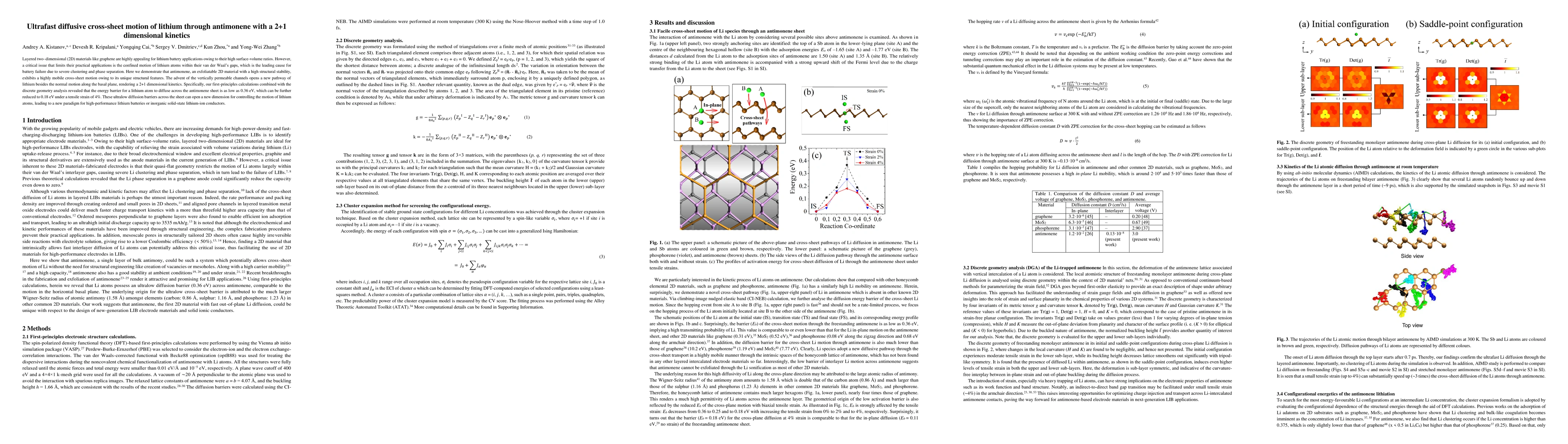 Layered two-dimensional materials like graphene are highly appealing for lithium battery applications owing to their high surface-volume ratios. However, a critical issue that limits their practical applications is the confined motion of lithium atoms within their van der Waal's gaps, which is the leading cause for battery failure due to severe clustering and phase separation. Here we demonstrate that antimonene, an exfoliatable 2D material with a high structural stability, exhibits a highly mobile cross-sheet motion owing to its unique structural features. The advent of the vertically permeable channels opens a new pathway of lithium besides the normal motion along the basal plane, rendering a 2+1 dimensional kinetics. Specifically, our first-principles calculations combined with the discrete geometry analysis revealed that the energy barrier for a lithium atom to diffuse across the antimonene sheet is as low as 0.36 eV, which can be further reduced to 0.18 eV under a tensile strain of 4%. These ultralow diffusion barriers across the sheet can open a new dimension for controlling the motion of lithium atoms, leading to a new paradigm for high-performance lithium batteries or inorganic solid-state lithium-ion conductors.